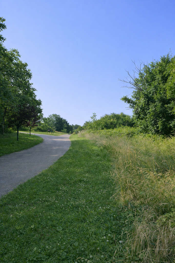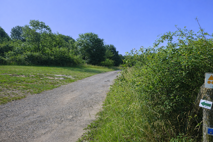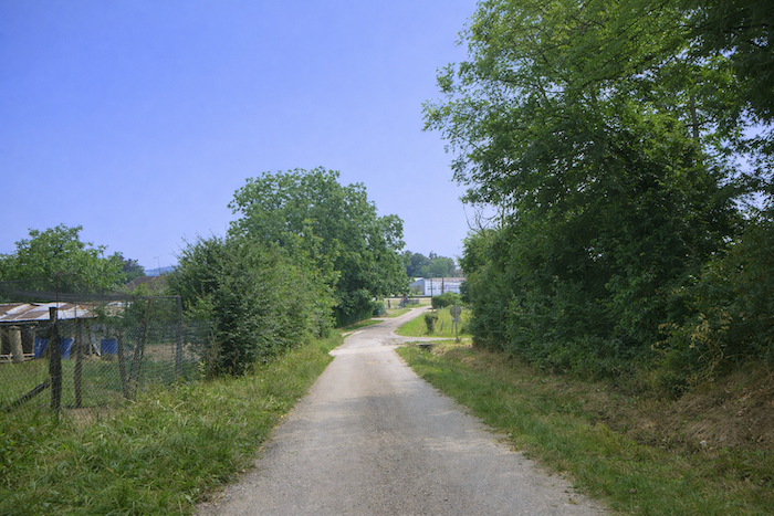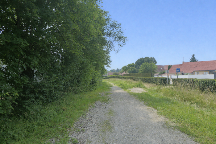 | Un chemin de terre et d’herbe longe ensuite une route et vous mène vers un rond-point, à deux pas seulement du centre de la cité. |