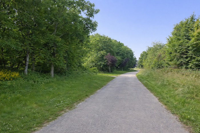 | La route en pente douce flirte avec un parc aux allées bordées d’arbres. |