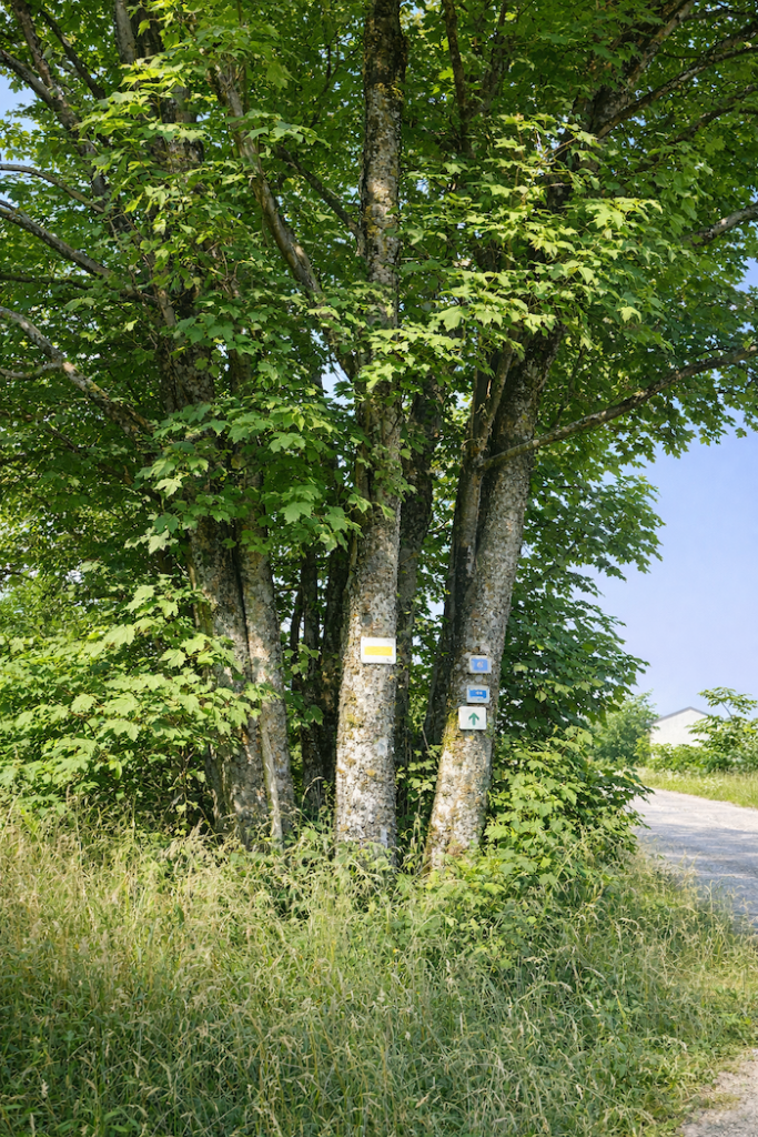 | La coquille de Compostelle apparaît souvent sur ce chemin, gravée, fixée ou peinte, comme une sentinelle immobile rappelant que vous êtes sur la voie des pèlerins. Pourtant, il faut garder en mémoire qu’ici, en Franche-Comté, elle n’indique en rien la direction à suivre. Ailleurs, un tel signe vous ferait croire que le chemin bifurque sur la gauche ; ici, il n’en est rien, car le chemin poursuit sa route en ligne droite. Ce rappel est essentiel : seul le jeu des flèches doit guider vos pas. |