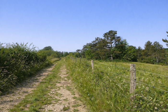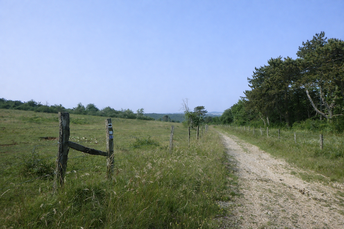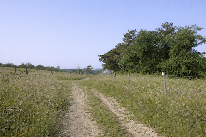 | Le chemin en pente reste pierreux le long des pelouses sèches. |