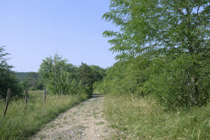 | Plus loin, le chemin amorce une descente douce, d’abord encore sous le couvert du sous-bois. |
