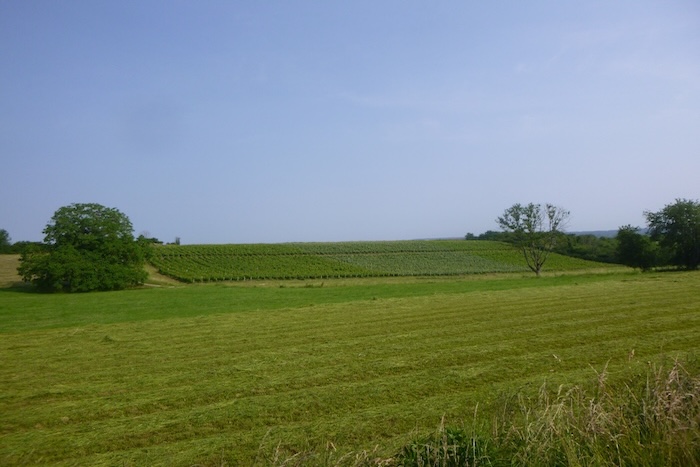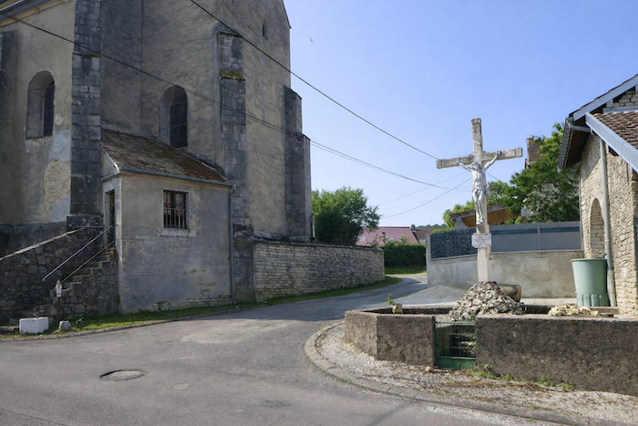 | La route s’étire ensuite longuement dans les prés. Le regard embrasse des étendues verdoyantes. Mais l’œil s’attarde aussi sur la vigne, rare et précieuse en ces contrées, comme un éclat inattendu de culture méditerranéenne transplantée dans le terroir comtois. Près d’une belle croix de pierre, dressée comme un signe de veille au bord du chemin, un banc attend le pèlerin. Ici, le voyageur peut déposer son sac, apaiser son souffle, et laisser ses yeux se perdre vers le sommet encore dissimulé. La croix, simple et massive, rappelle que chaque pause sur le chemin peut devenir méditation. |