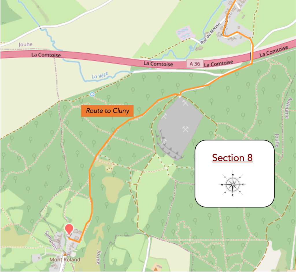 You are now at the place known as « Le Pont Vert ». From here, some pilgrims may yield to the temptation of heading directly to Sampans, thus avoiding the climb to Mont Roland. But to do so is to deprive oneself of an essential stage, to turn away from an inner experience. To bypass Mont Roland is to renounce the encounter. Yet there are always those who prefer to shorten time, as if the route were merely an obstacle. For others, by contrast, slowness is the very essence of pilgrimage.