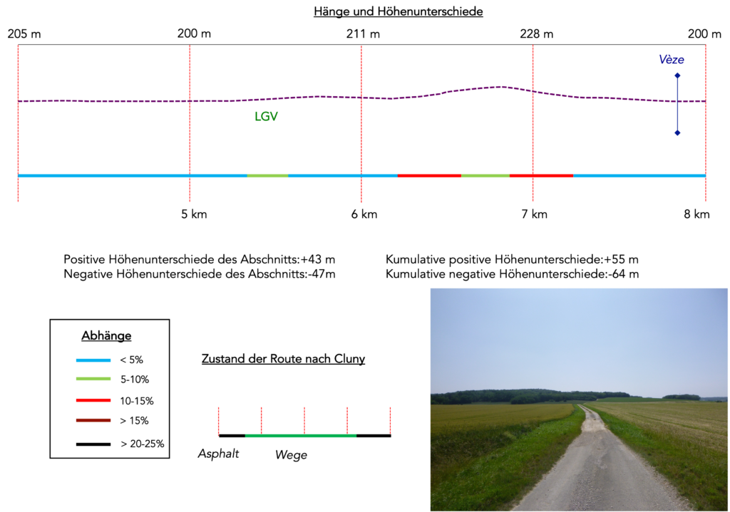 Die Strecke wird eintönig. Lang und gestreckt stellt sie die Geduld auf die Probe. Alle zehn Minuten wird die Ebene von der Blitzhaftigkeit des Hochgeschwindigkeitszuges durchquert. Man hört ihn von sehr weit herkommen, wie ein anschwellendes Grollen, bevor sein Donner die Luft zerschneidet und sofort wieder verschwindet. Dieser harte Kontrast zwischen der Bewegungslosigkeit des Wanderers und der Schnelligkeit des Zuges verleiht der Pilgerschaft eine seltsame Intensität.