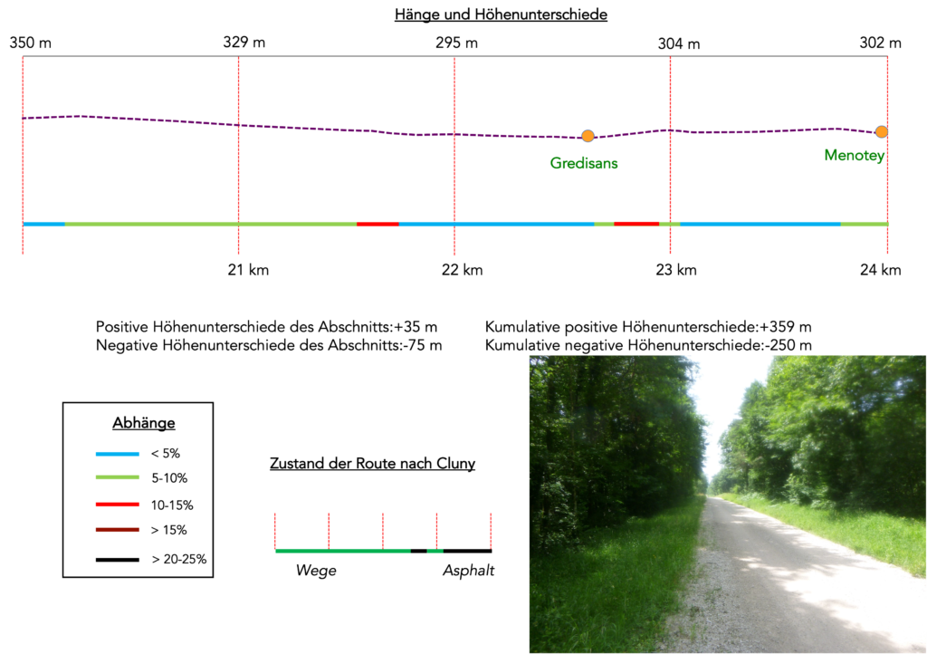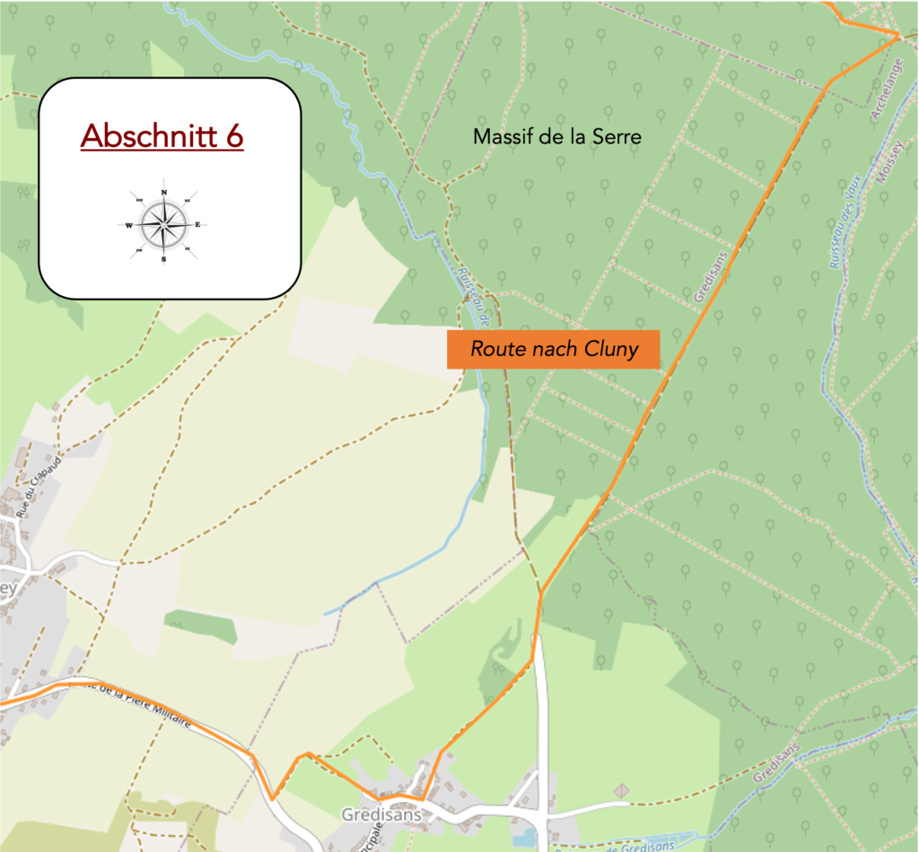 Wenn man den Ort La Meulière erreicht, ergreift einen ein Gefühl der Erlösung. Man hat die Hölle des Bois de Grédisan hinter sich gelassen, kaum zwei Kilometer entfernt, doch das Dorf Menotey liegt noch immer mehr als vier Kilometer vor einem. Zwei Wege führen zum Dorf, doch der Pilger weiß, dass er der Muschel folgen muss, dieser treuen und unverzichtbaren Führerin.