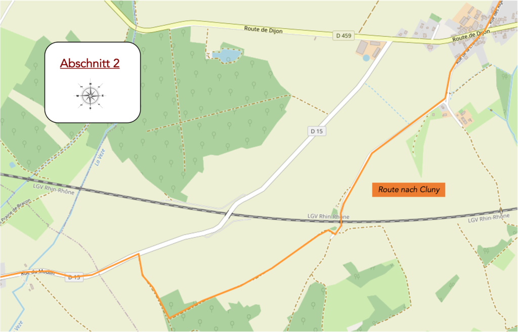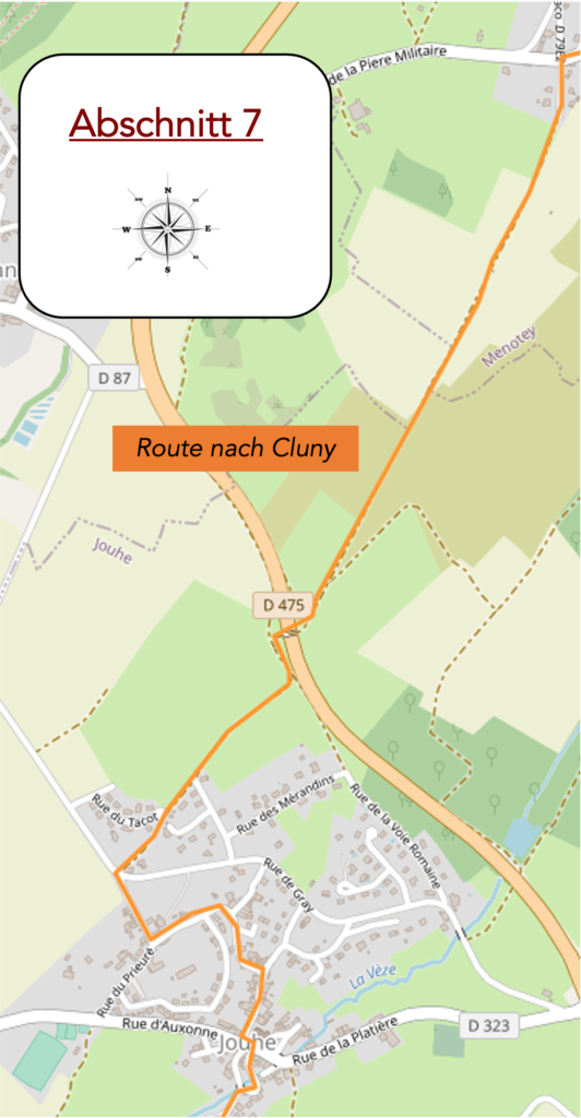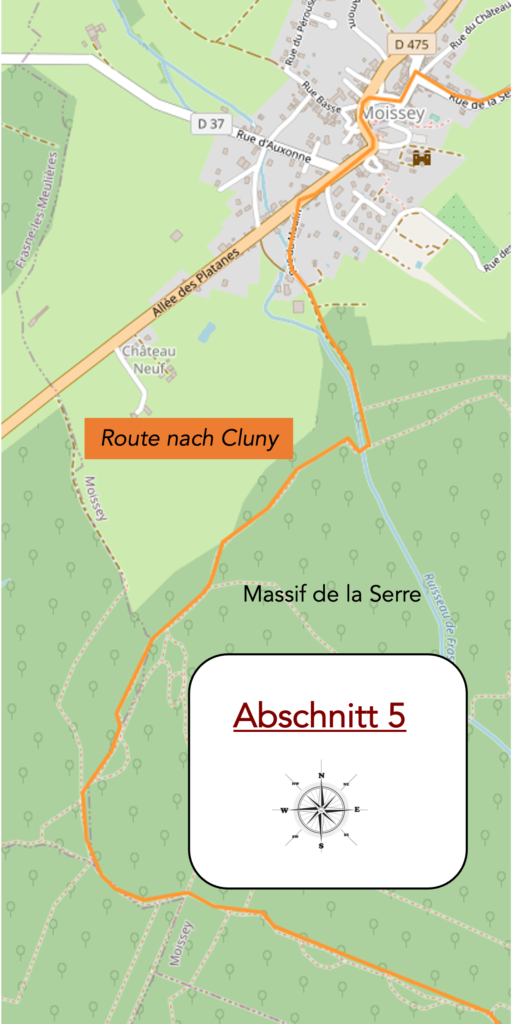 Am Ende des Abstiegs überquert der Weg die große Departement Straße D475, laut und vertraut, der man bereits in Moissey begegnet ist. Der Gegensatz zwischen der Ruhe des Weges und dem unablässigen Lärm der Straße ist eindrucksvoll.