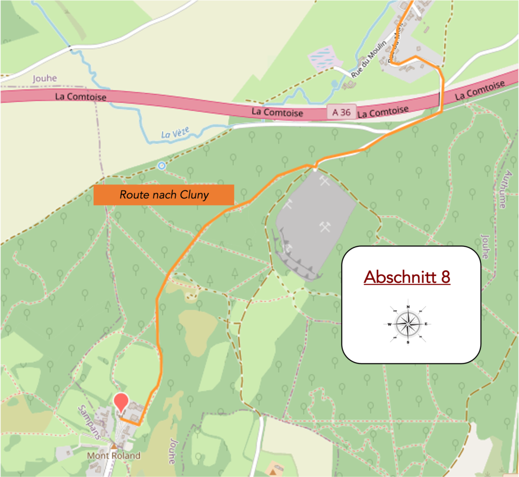 Man befindet sich nun am Ort « Le Pont Vert ». Von hier aus geben manche Pilger der Versuchung nach, direkt nach Sampans zu gehen und so den Aufstieg zum Mont Roland zu umgehen. Doch das hieße, auf eine wesentliche Etappe zu verzichten und einer inneren Erfahrung den Rücken zu kehren. Den Mont Roland auszulassen bedeutet, der Begegnung auszuweichen. Dennoch gibt es immer wieder jene, die die Zeit verkürzen wollen, als wäre der Weg nur ein Hindernis. Für andere hingegen ist gerade die Langsamkeit das Wesen der Pilgerschaft. .