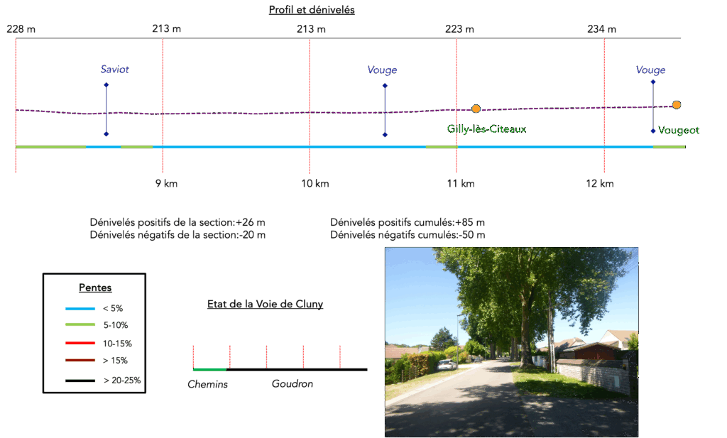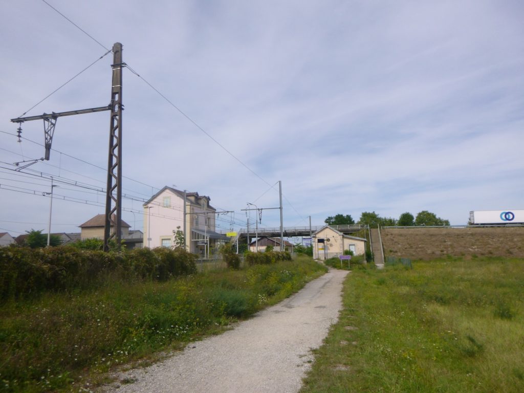 | Un peu plus loin, le guide murmure : “Avant les lignes à haute tension, prenez le sentier herbeux qui remonte la Vouge“. Sur le bas-côté, il existe bien une ouverture, mi-sentier, mi-illusion, qui semble inviter à l’aventure. Mais à ce stade du chemin, après tant de chausse-trappes et de faux départs, et comme nulle coquille ne l’atteste, il est sage de renoncer à cette échappée incertaine. La route, fidèle, conduit droit vers Gilly, visible déjà à l’horizon, comme un havre attendu. |