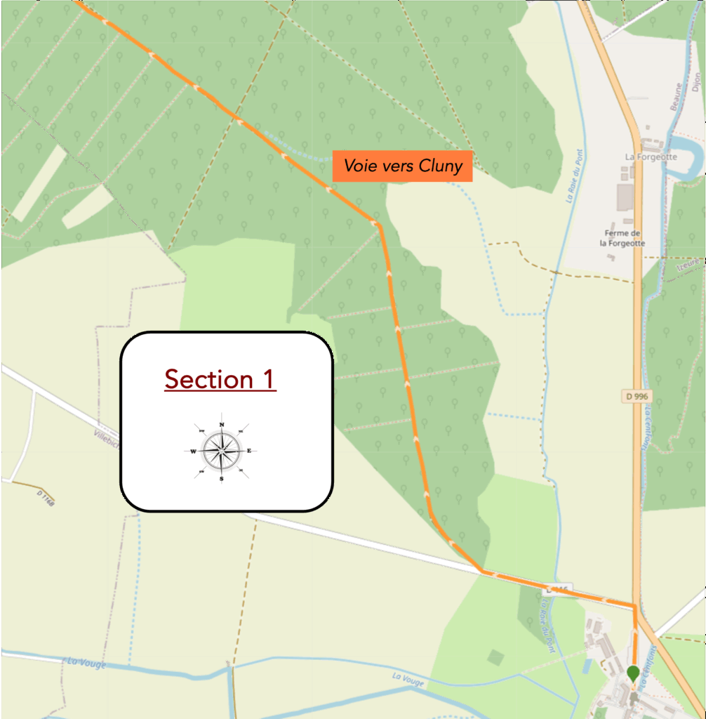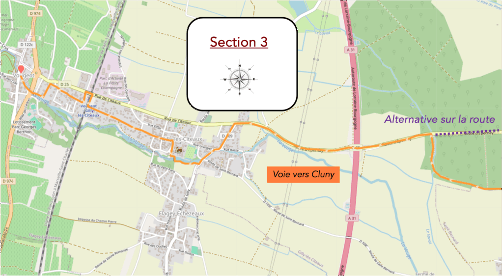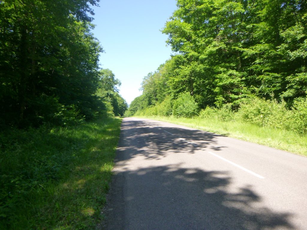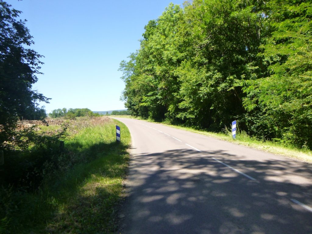 | Après avoir franchi la Vouge par un modeste pont, le parcours emprunte brièvement la Route de Flagey. Cette traversée, quoique rapide, donne au voyageur le sentiment de s’avancer encore davantage vers le cœur historique et spirituel de la contrée. La route devient ainsi une transition, un passage, presque un rite, avant de s’enfoncer dans la mémoire des lieux. |