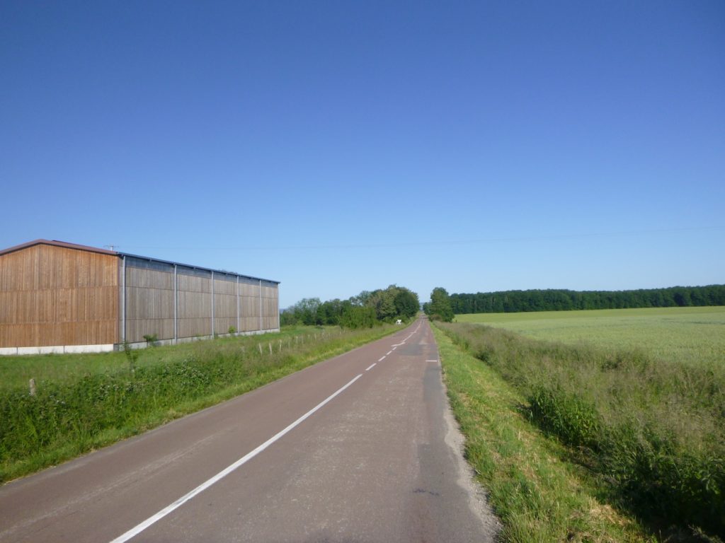 | Elle finit par croiser une petite route agricole, discrète et usée, et s’approche d’un nouveau bosquet qui surgit comme une promesse d’ombre dans cette mer de champs. |