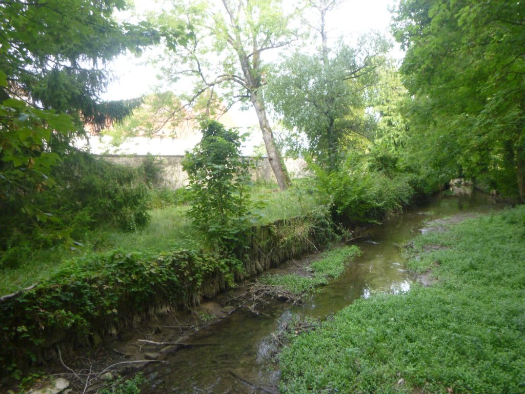 | Un sentier herbeux s’ouvre alors, longeant le sous-bois du château. Bordé d’un vieux mur moussu, il court en parallèle au ruisseau qui murmure à votre droite. |