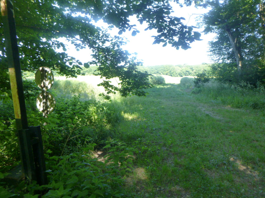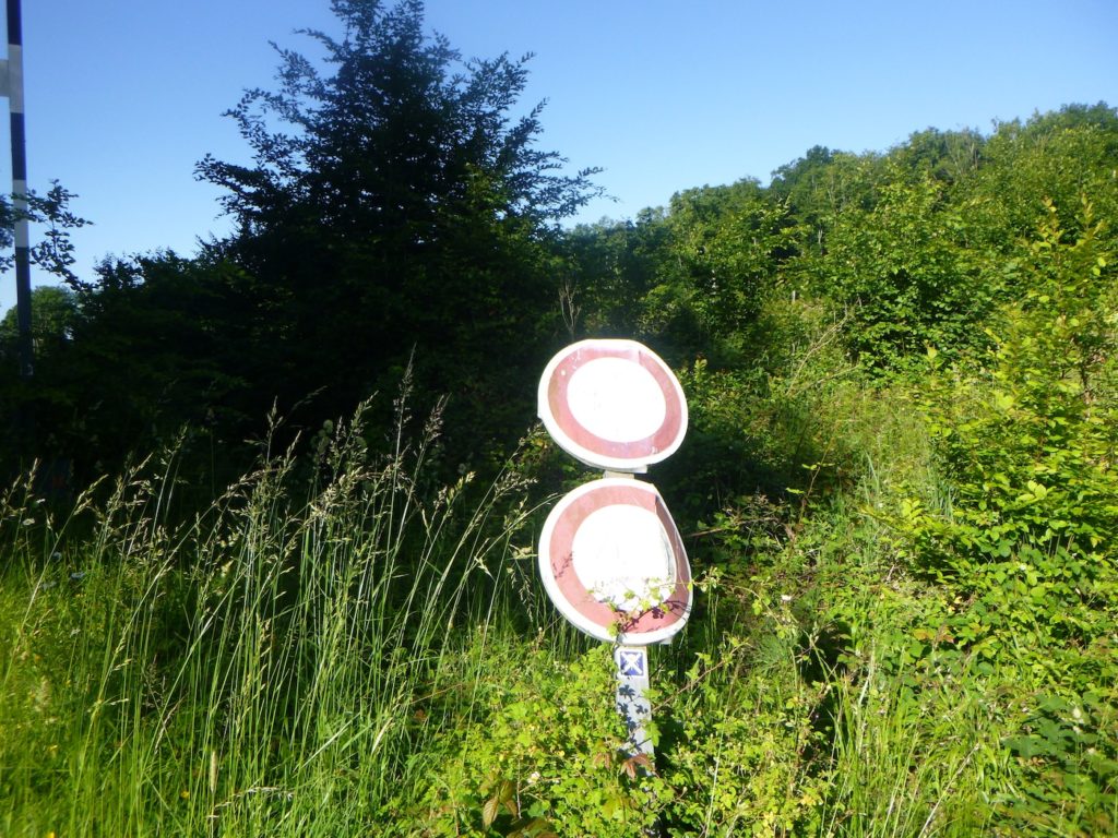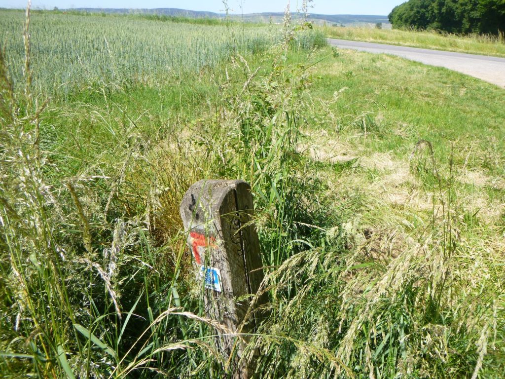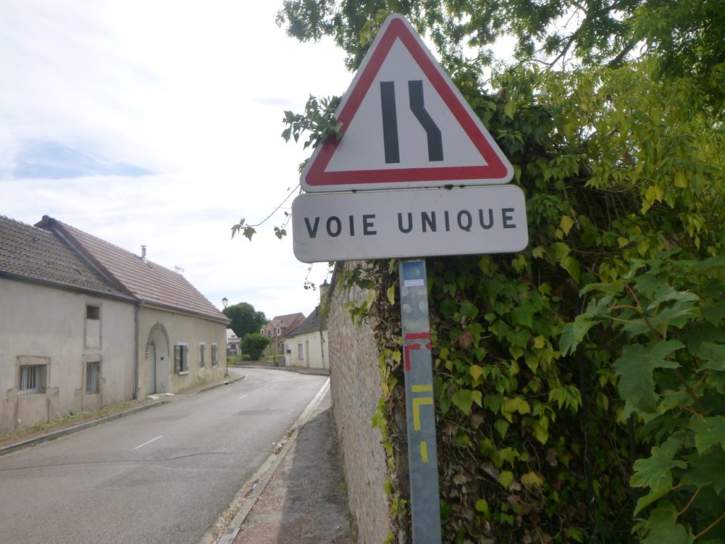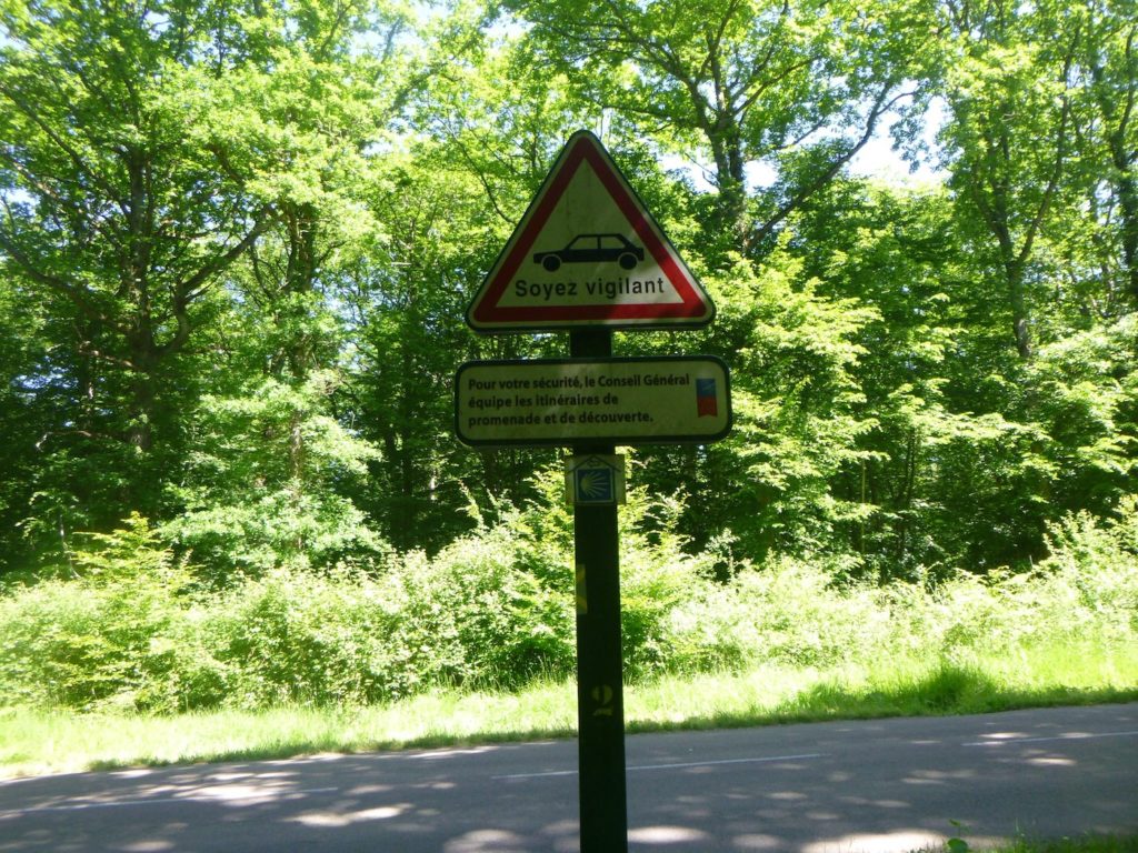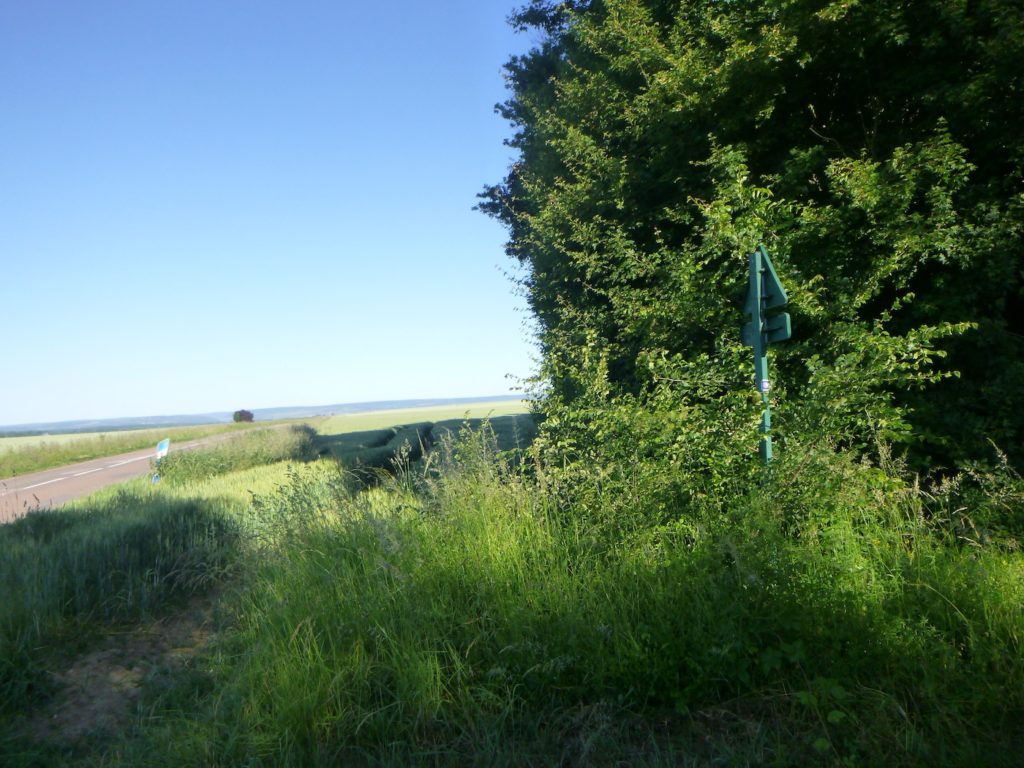 | Et voici que le doute s’invite à nouveau. Le guide vous prévient : “Prendre à droite la route. Après quelques mètres, emprunter à gauche le petit sentier longeant la forêt. Le suivre pour déboucher plus loin sur la départementale D25“. Oui, une coquille, discrète et presque avalée par les hautes herbes, vous indique de suivre la route vers la droite. Mais pas de trace claire d’un sentier. Et pourtant, il y a bien un chemin qui longe la lisière du bois, mais il est mal dessiné dans les hautes herbes, peu engageant. L’incertitude s’épaissit ici comme une brume. Ce fléchage approximatif, dans toute cette région, frôle parfois l’absurde, d’autant plus qu’un signe de direction peint en rouge, vous incite à prendre la route. Alors, avec un soupçon de résignation, choisissez la sagesse : suivrez simplement la route à droite. Au bout de la route, tournez à gauche en direction de Gilly. Après tout, peu importe l’embranchement choisi, les deux conduisent à la D25 sur la route de Gilly. |
