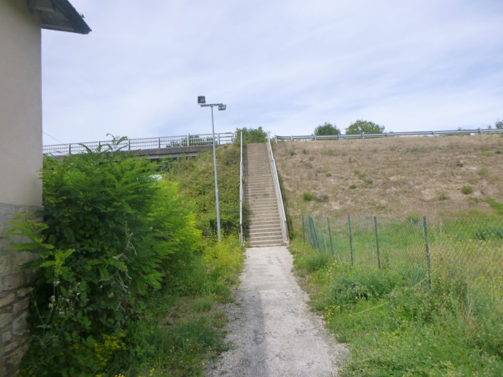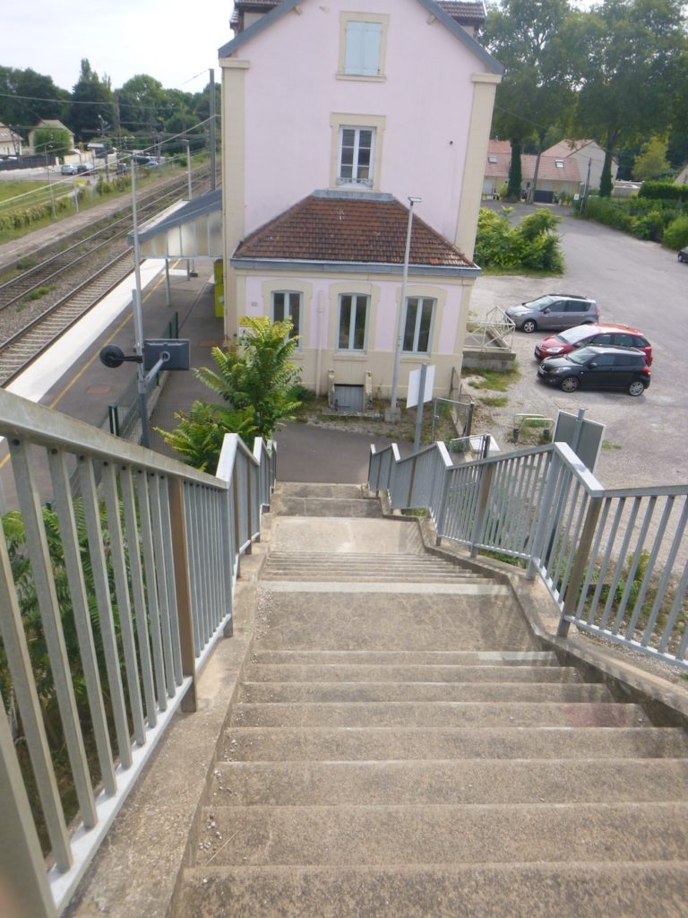 | Deux rampes d’escaliers, symétriques, permettent de franchir l’obstacle ferroviaire et d’accéder à la gare par deux côtés différents. |