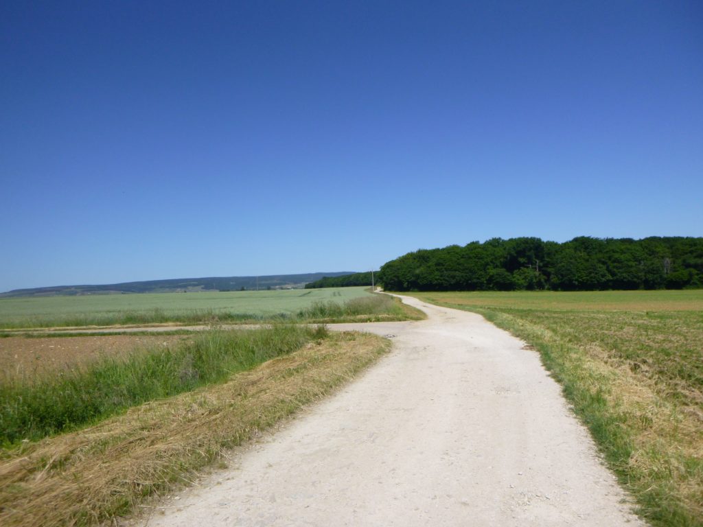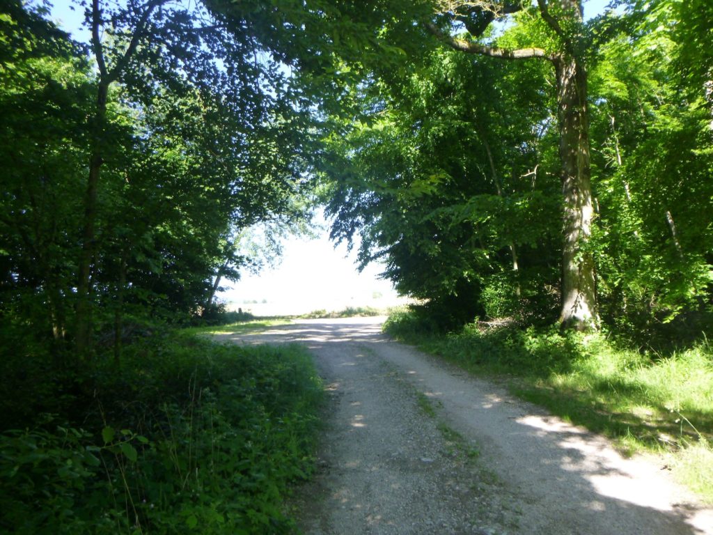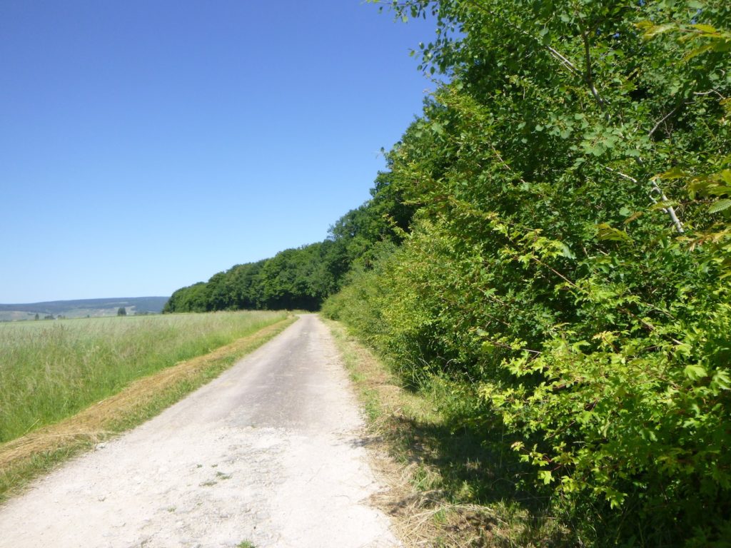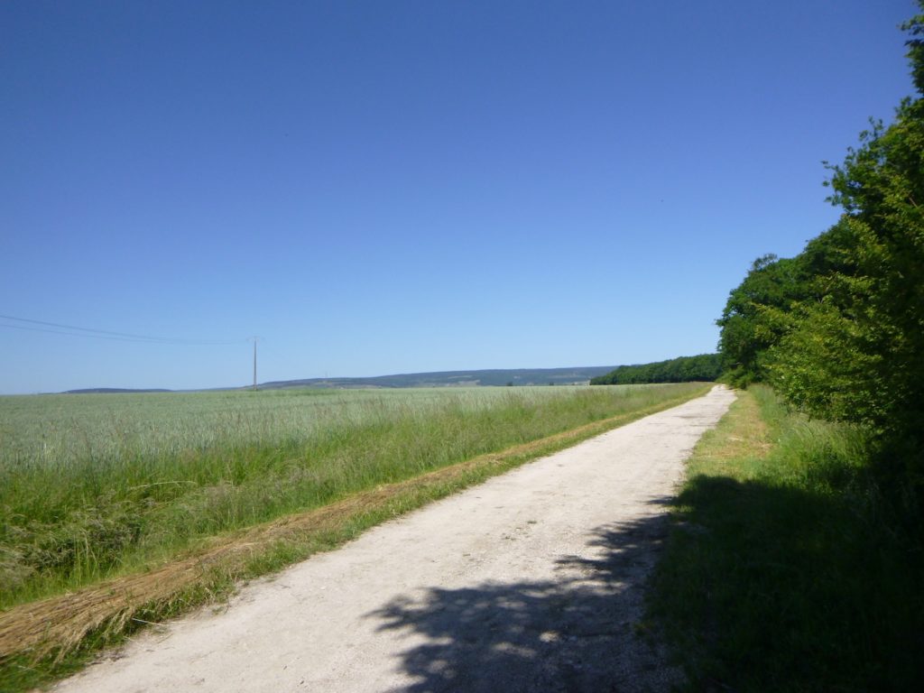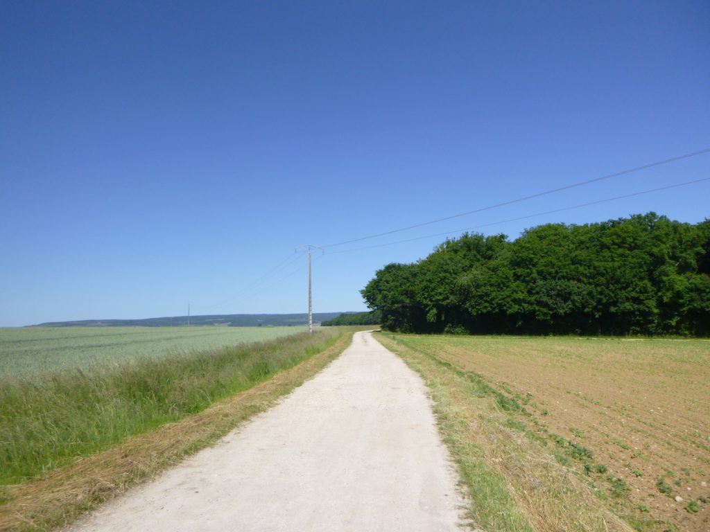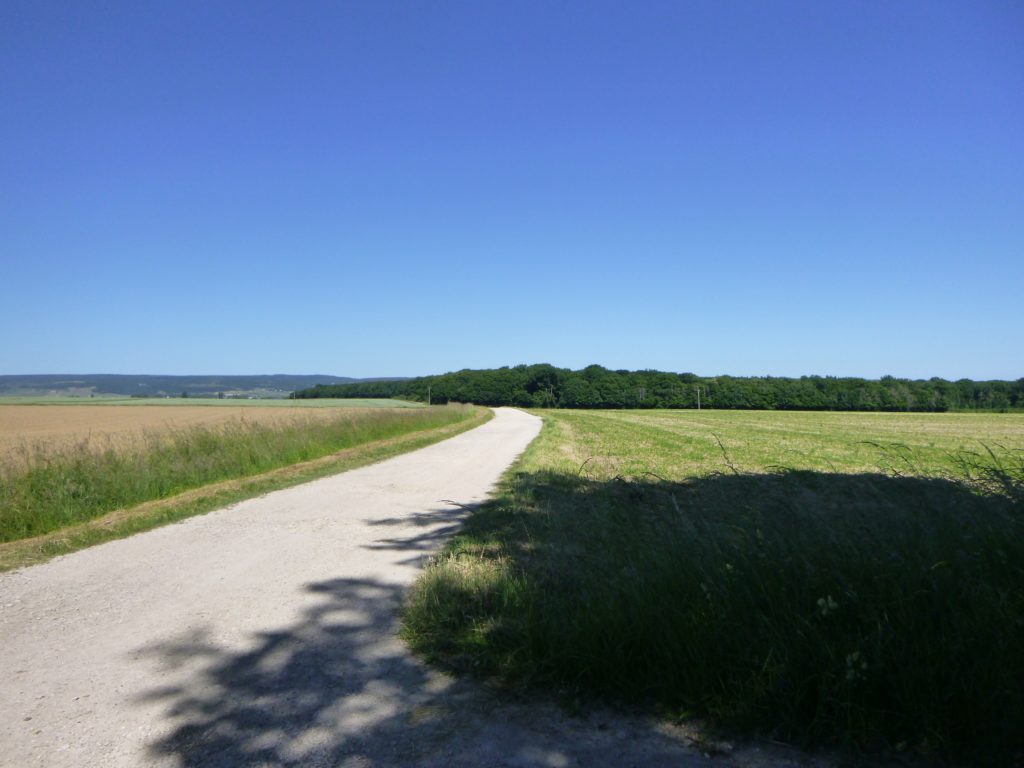 | Alors, le chemin longe le bois, patiemment, longuement, comme s’il lui faisait la cour. À perte de vue, les champs déroulent leur monotonie ondulante, et le chemin, imperturbable, trace son sillon entre nature et cultures. |