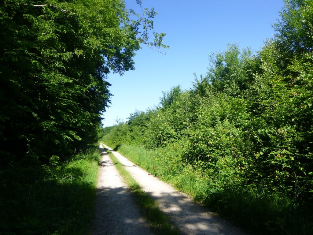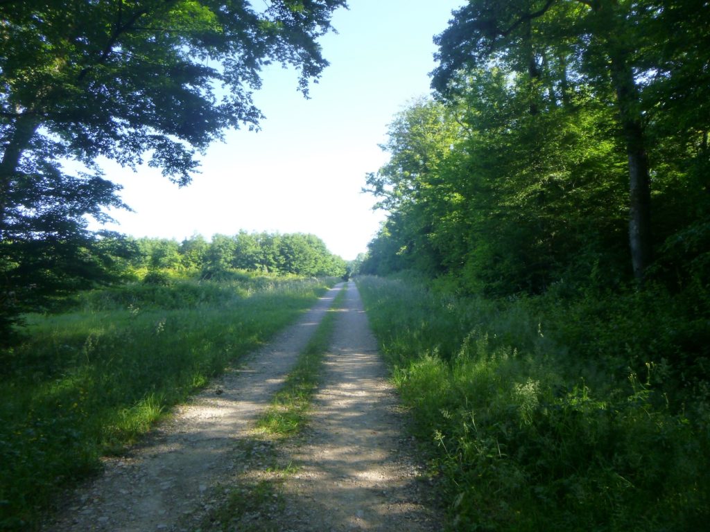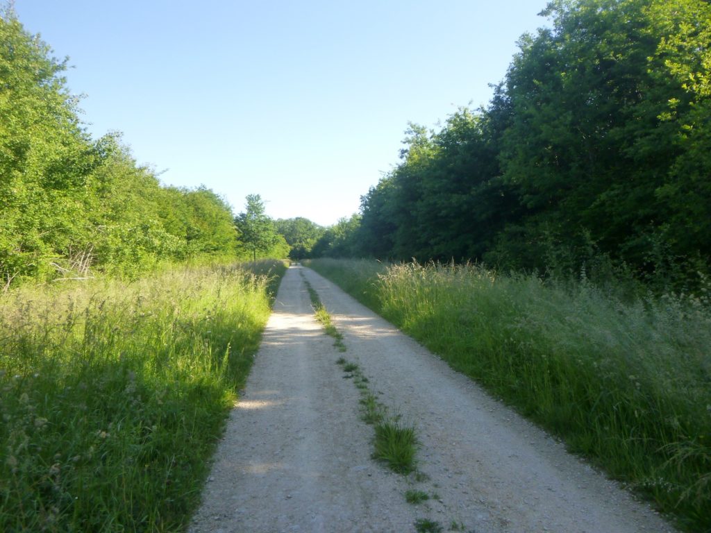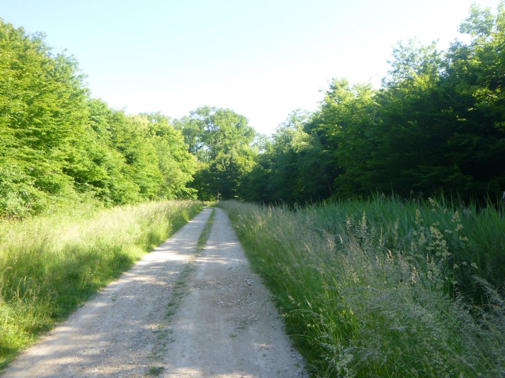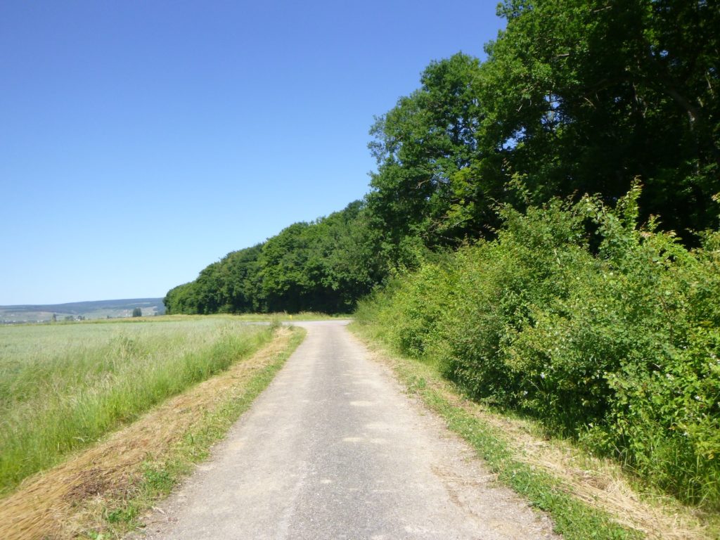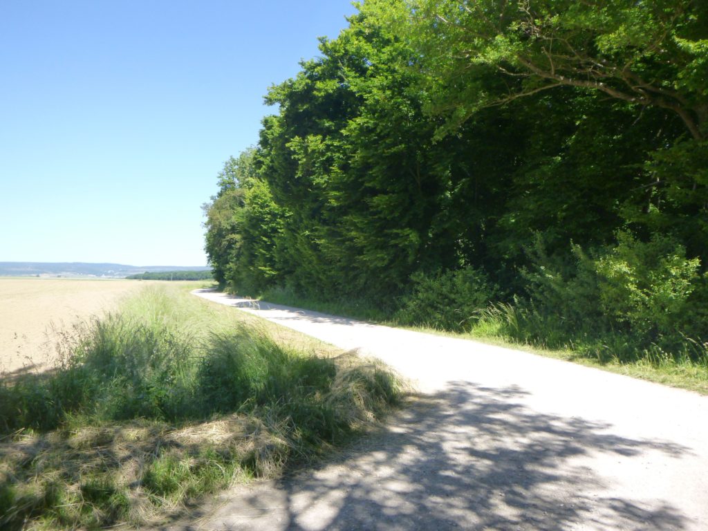 | Alors, le chemin longe le bois, patiemment, longuement, comme s’il lui faisait la cour. À perte de vue, les champs déroulent leur monotonie ondulante, et le chemin, imperturbable, trace son sillon entre nature et cultures. |