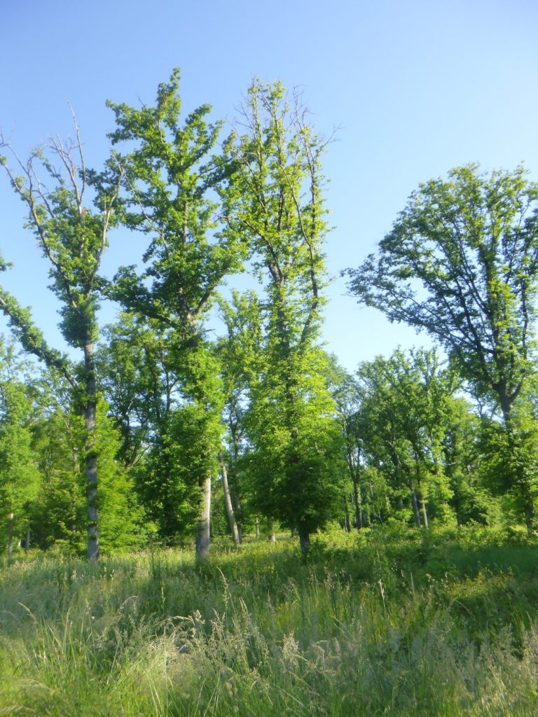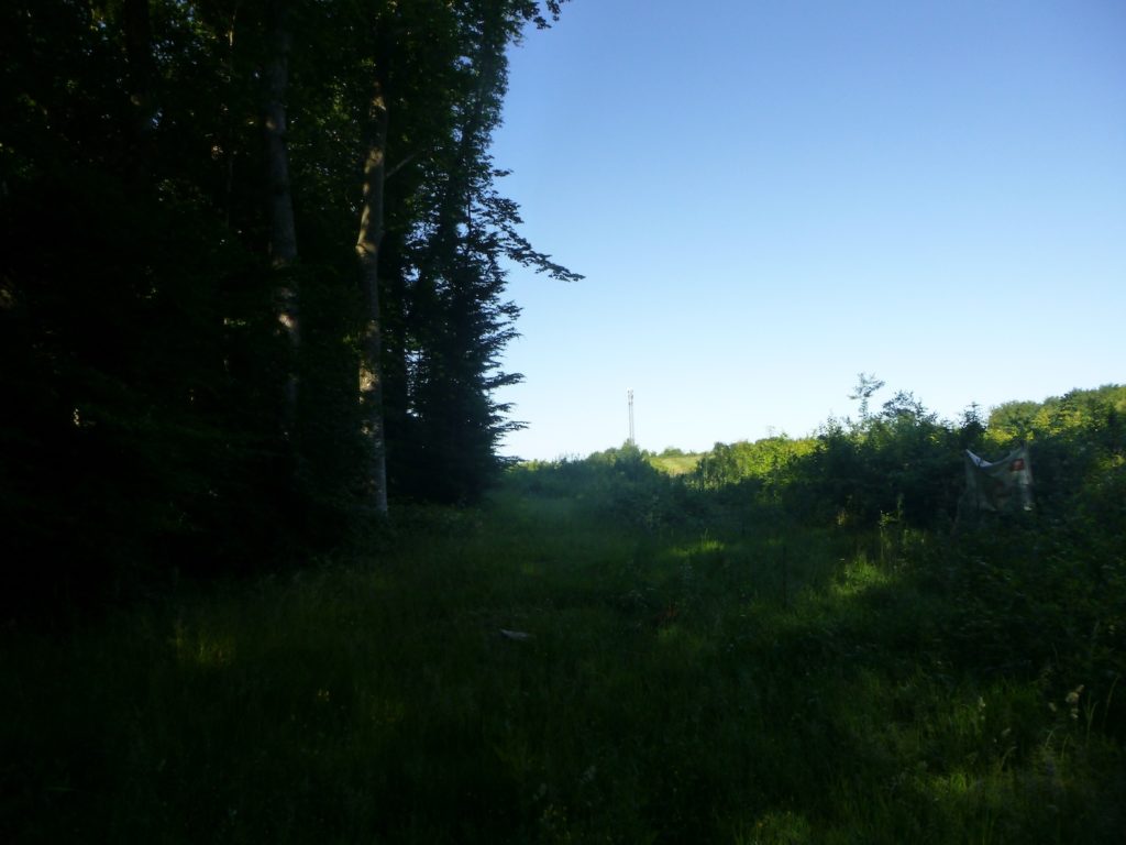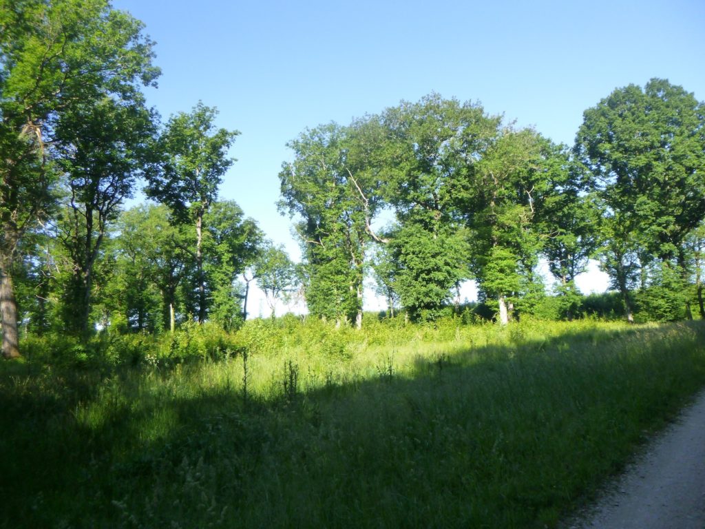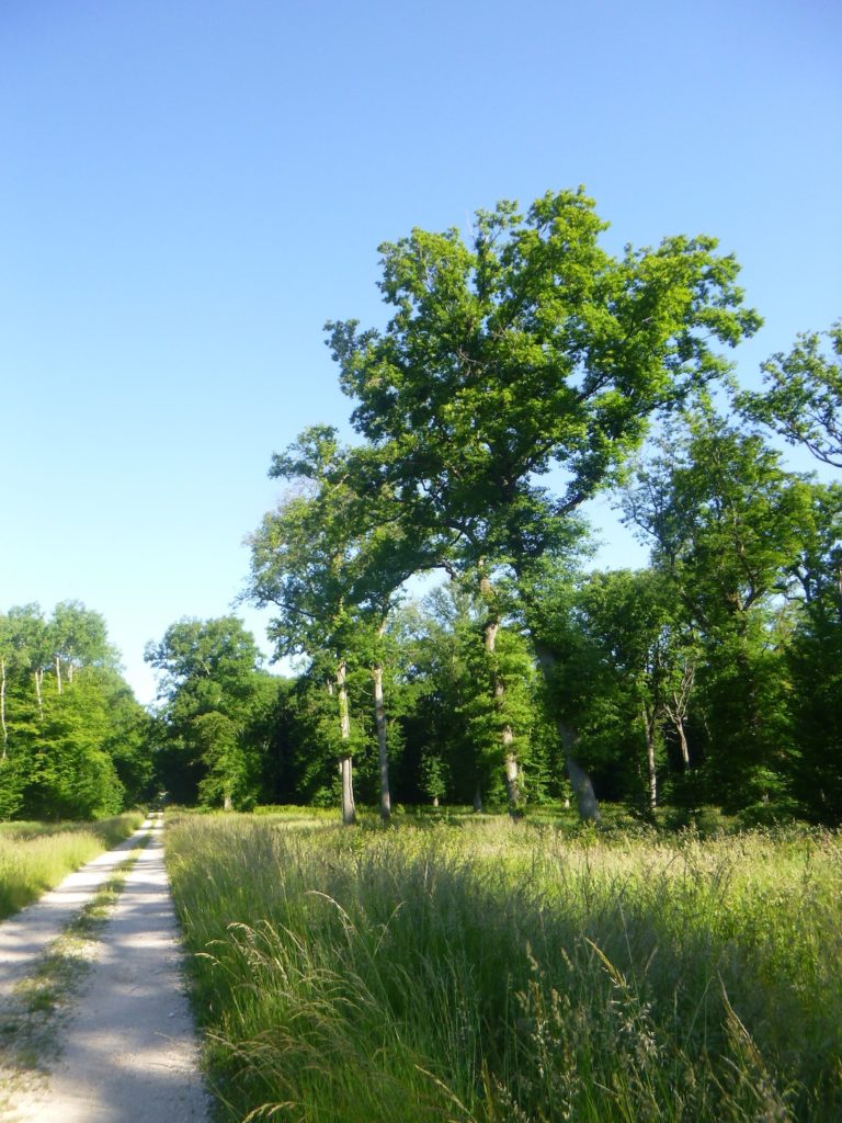 | Puis, sans crier gare, le chemin s’échappe enfin du couvert des arbres. Il débouche dans une clairière vaste et lumineuse, un souffle d’air après la densité du bois. |