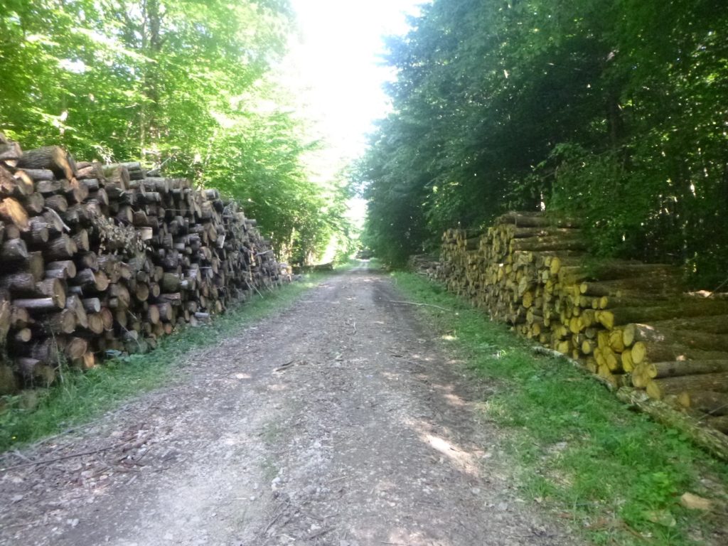 | Le chemin poursuit sa course au cœur du bois, serpentant sur la terre battue, que les lourds pneus des tracteurs forestiers ont par endroits labourée. Le sol en garde les cicatrices, comme un parchemin griffonné par des mains impatientes. |