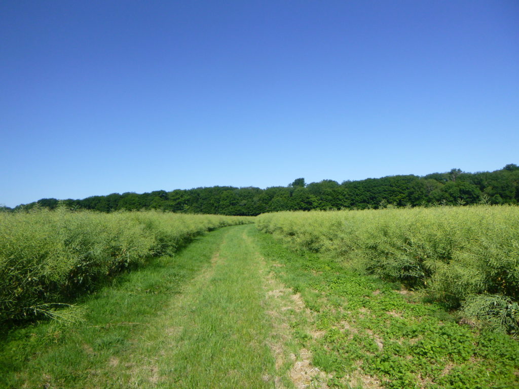 | Ici, aujourd’hui, c’est une mer d’oléagineux qui vous accueille : le chemin traverse un océan de colza, ondulant sous la brise comme une houle végétale. Des centaines d’hectares vibrent sous le soleil. Demain, ce pourrait être du blé, du tournesol ou de la jachère. La terre change de visage au rythme des saisons et des hommes. |
