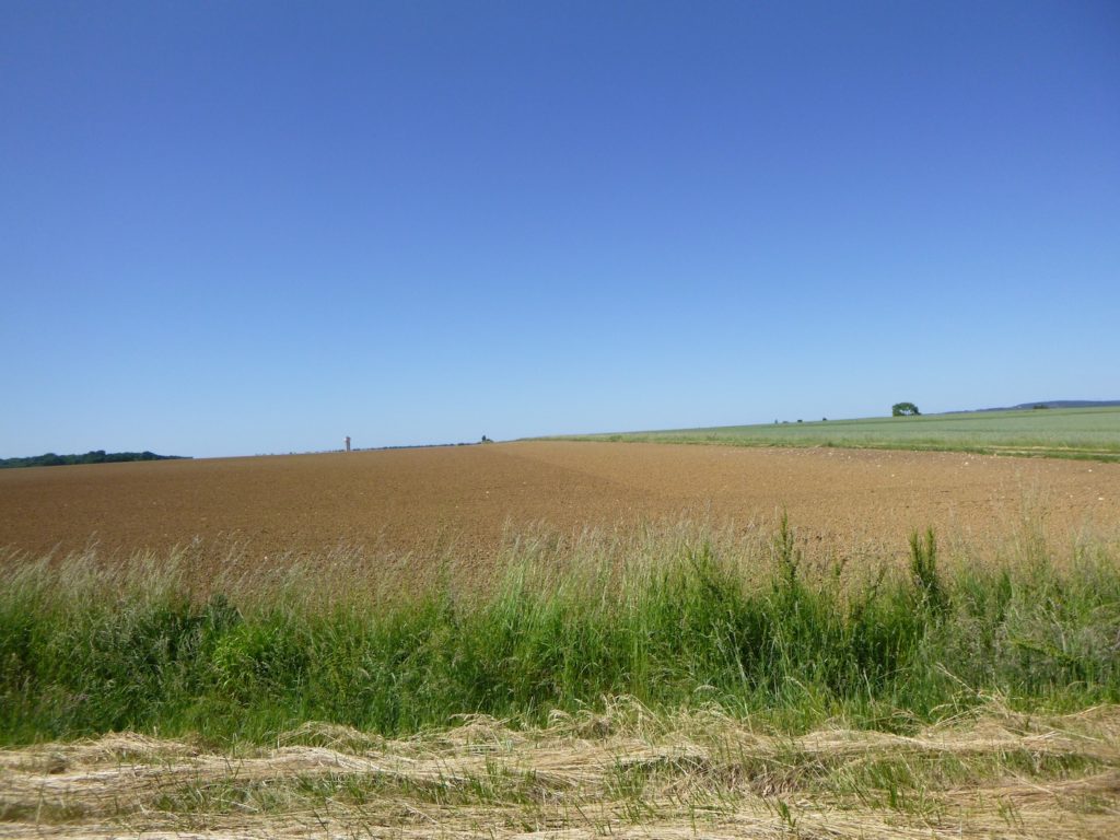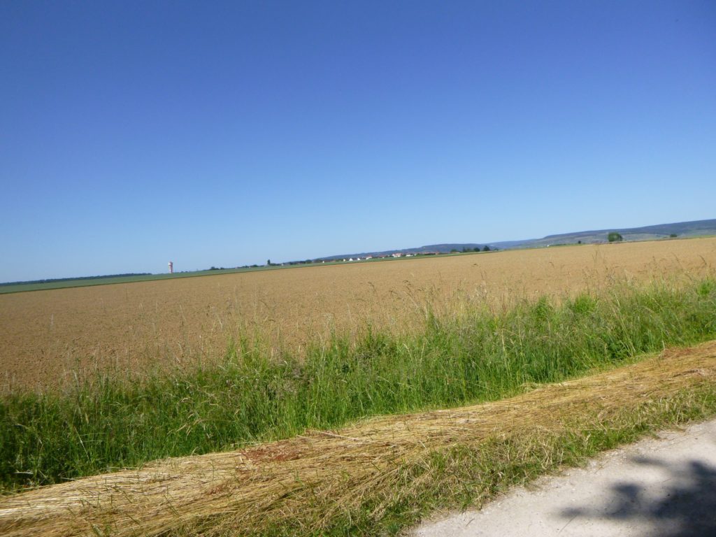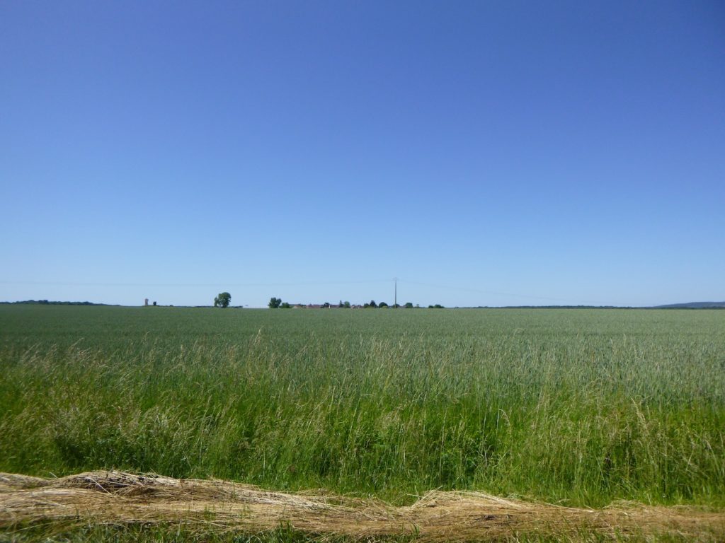 | La route, ensuite, s’ouvre largement sur la plaine. Elle fend de vastes champs qui s’étirent à perte de vue, véritables nappes dorées ou vertes, suivant la saison, où la main des hommes dialogue avec la patience de la terre. |