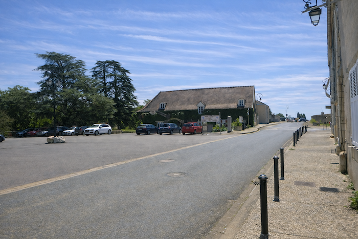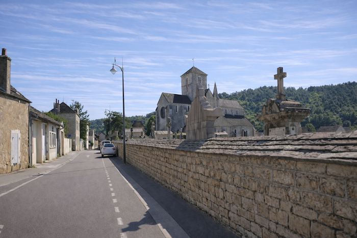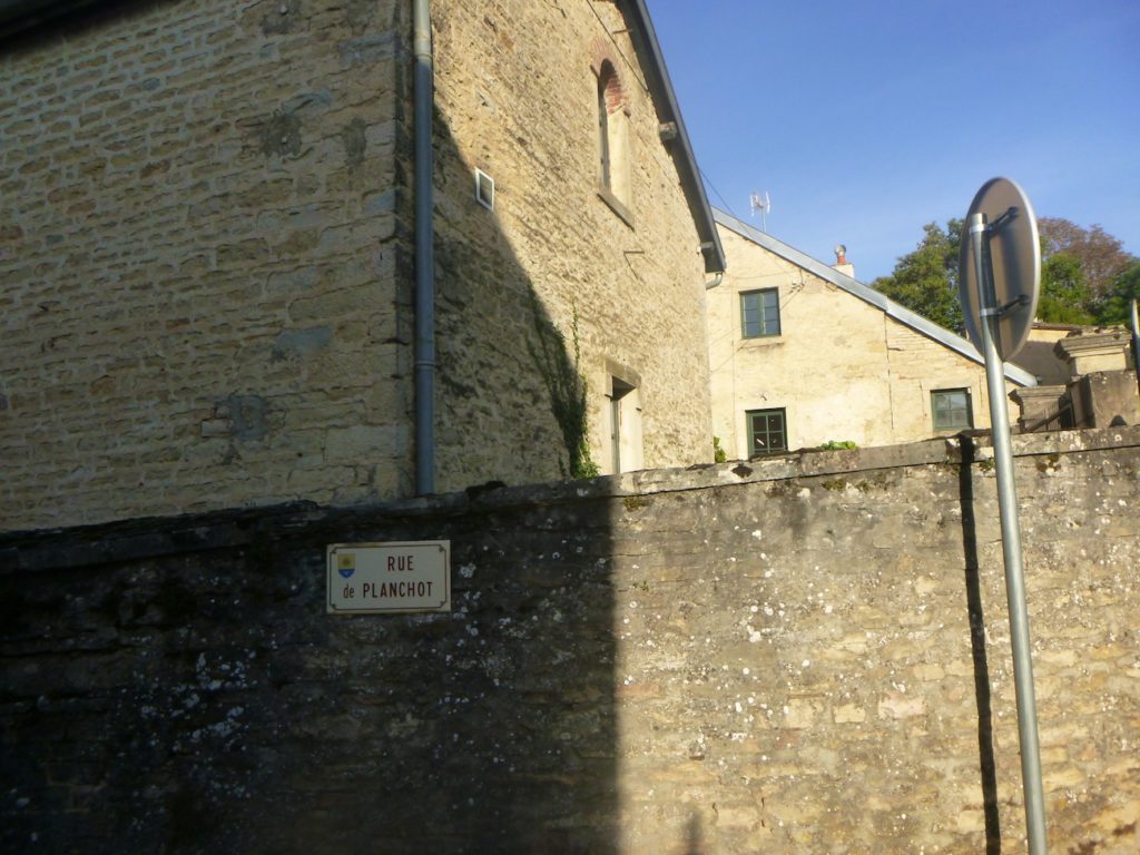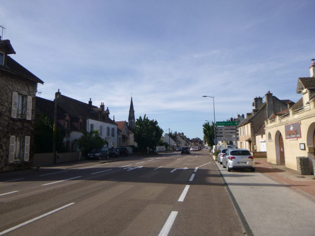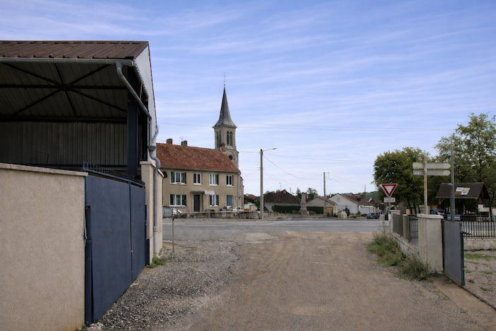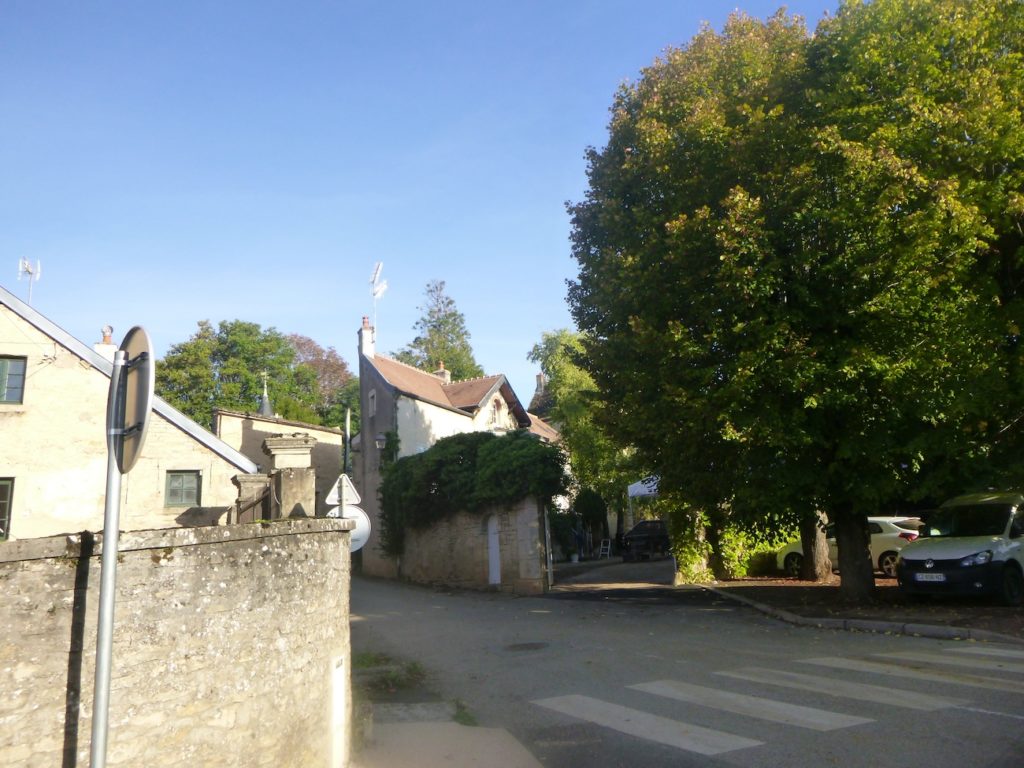 From the village square, the route slopes gently and descends Rue Planchot, slipping behind the church.