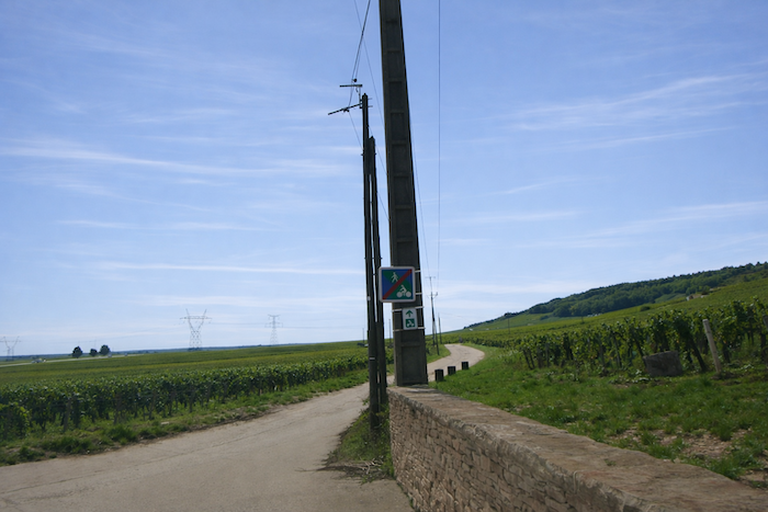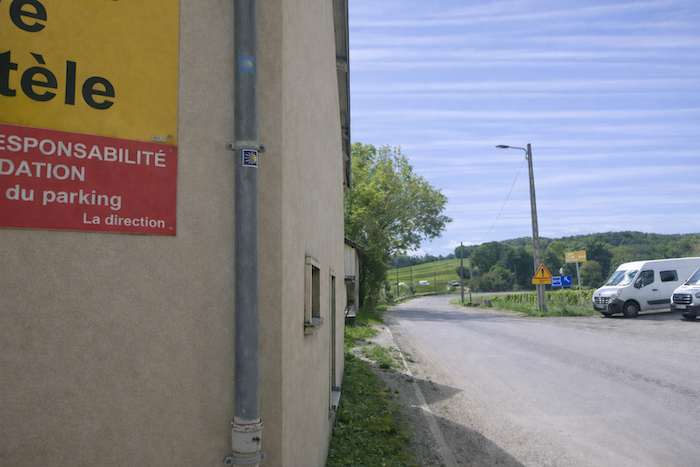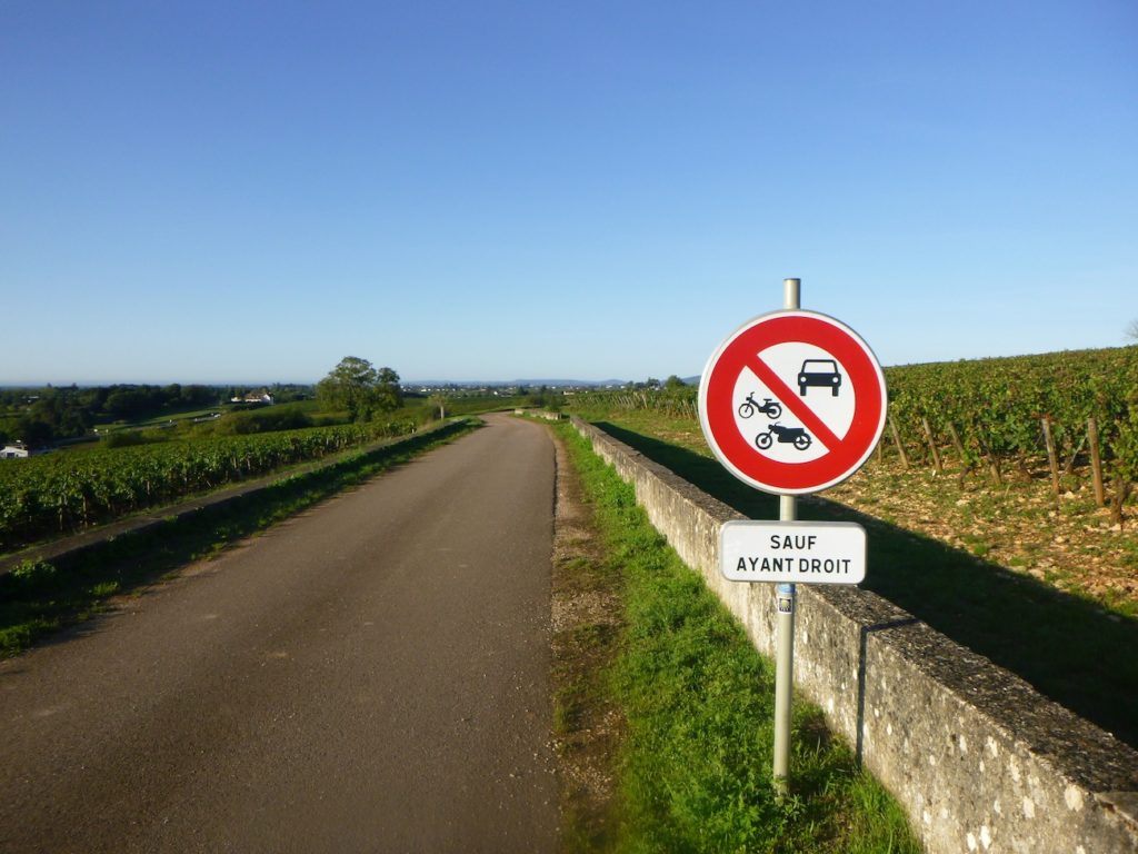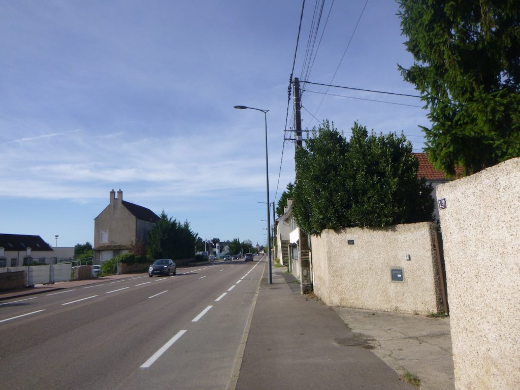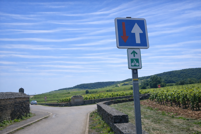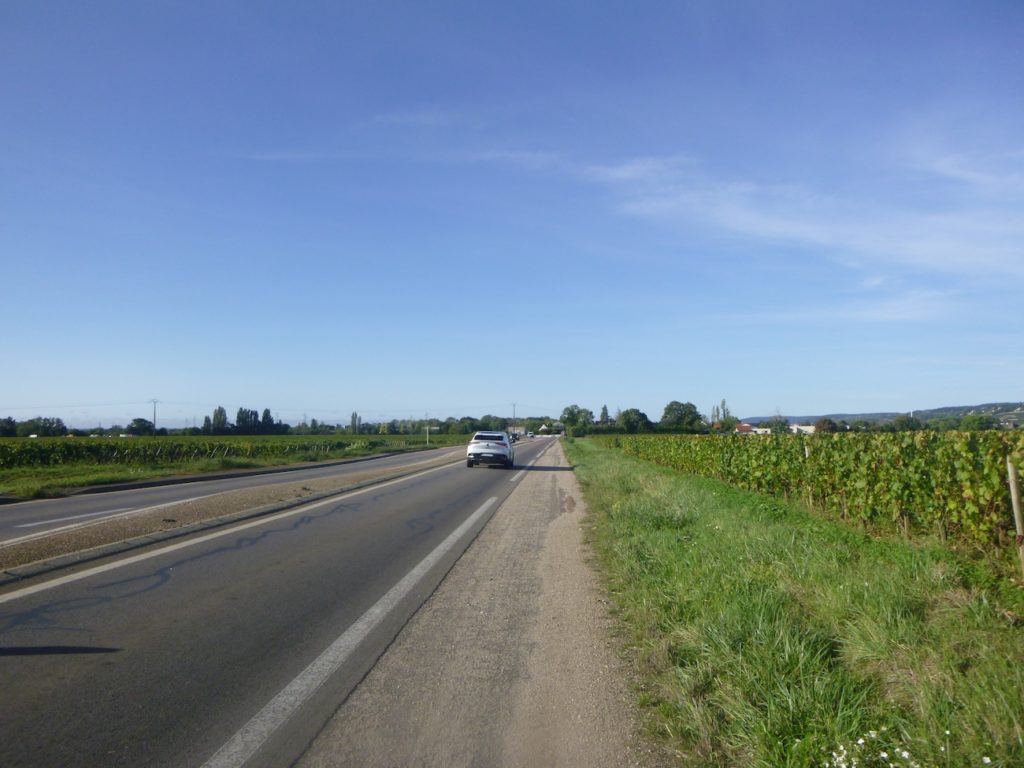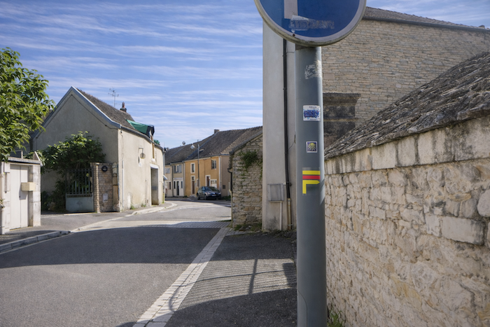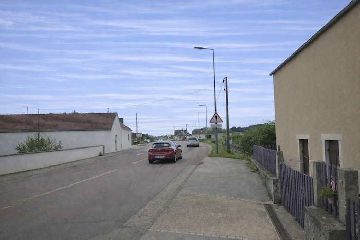 Is this finally the famous D115c you were looking for? Probably so, since a little further on a scallop appears, unnecessary yet reassuring. It confirms that you are on the correct route. One cannot help wondering why it was not placed at the picnic area. One might almost think that those who lay out the route in Burgundy take a mischievous pleasure in planting their scallops in the most obvious places, fixed to a post or a wall where no one needs them, when a clear indication would be far more useful in moments of uncertainty.