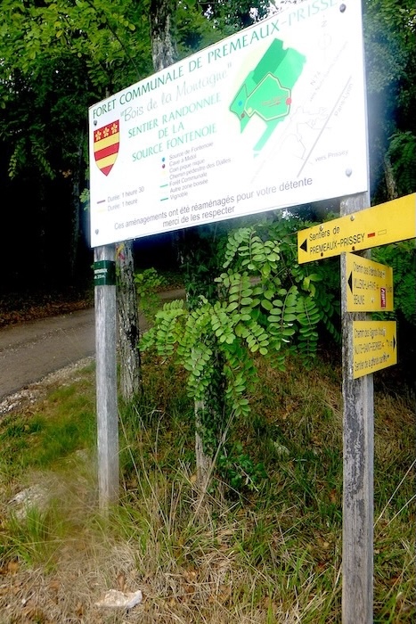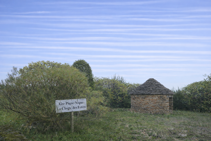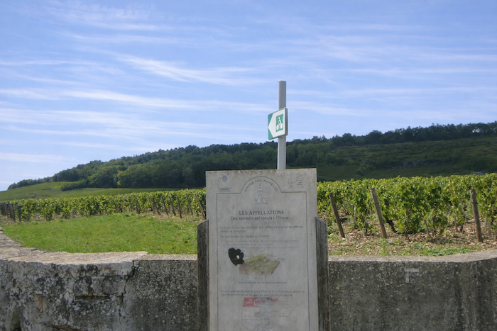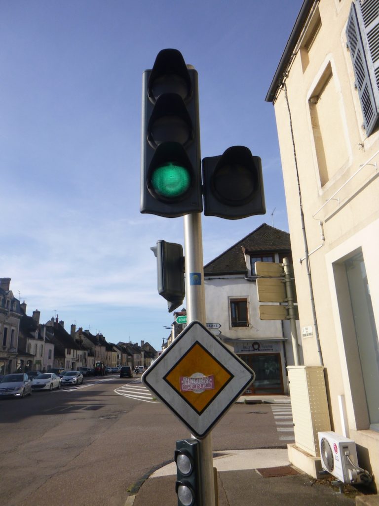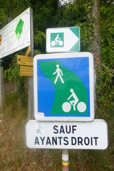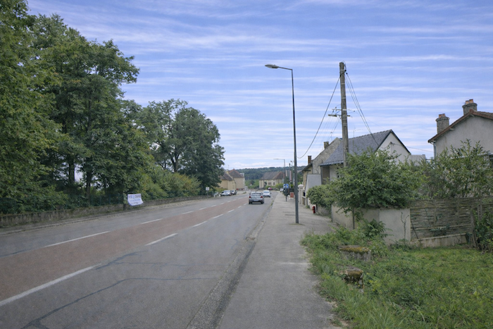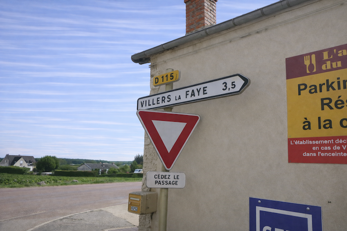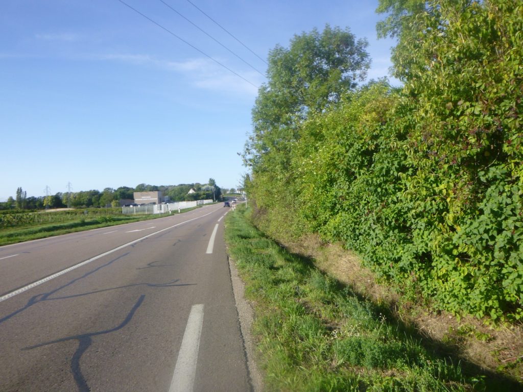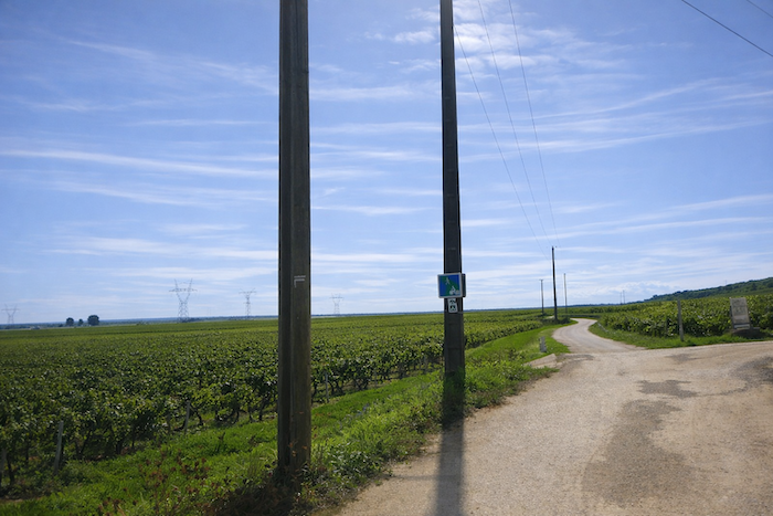 Is this finally the famous D115c you were looking for? Probably so, since a little further on a scallop appears, unnecessary yet reassuring. It confirms that you are on the correct route. One cannot help wondering why it was not placed at the picnic area. One might almost think that those who lay out the route in Burgundy take a mischievous pleasure in planting their scallops in the most obvious places, fixed to a post or a wall where no one needs them, when a clear indication would be far more useful in moments of uncertainty.