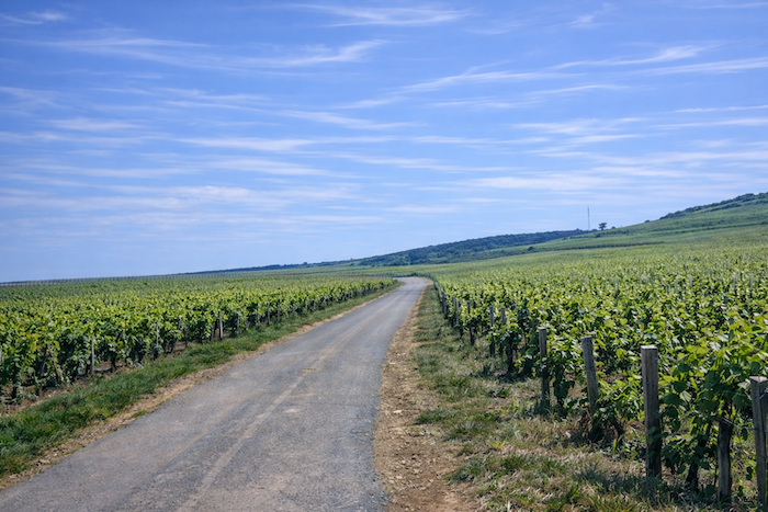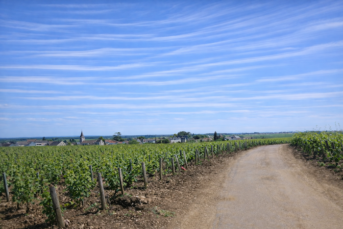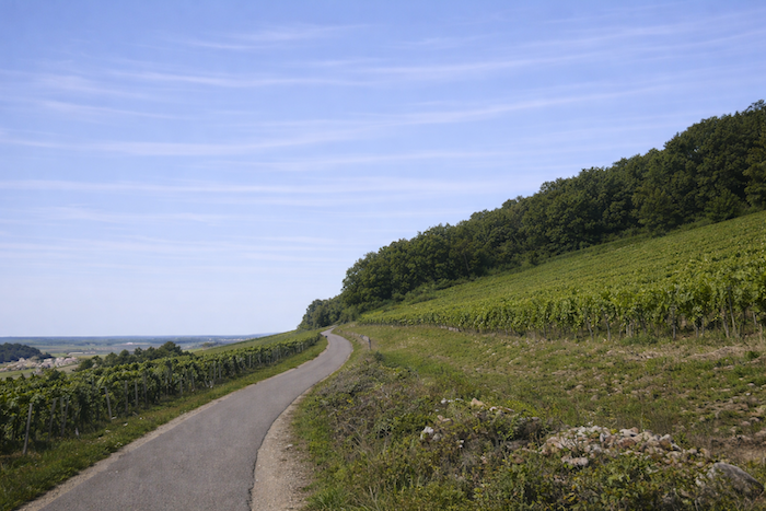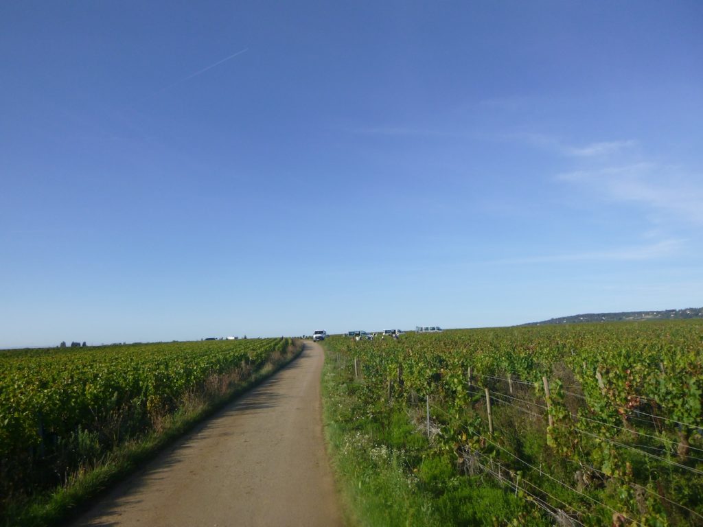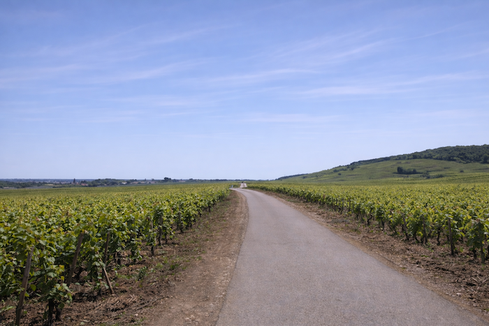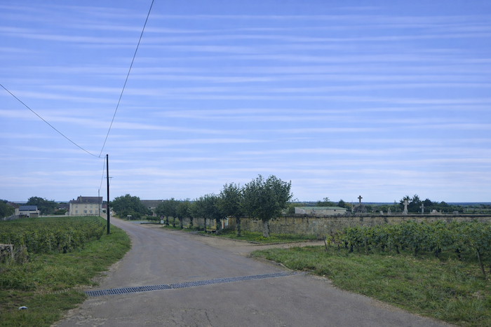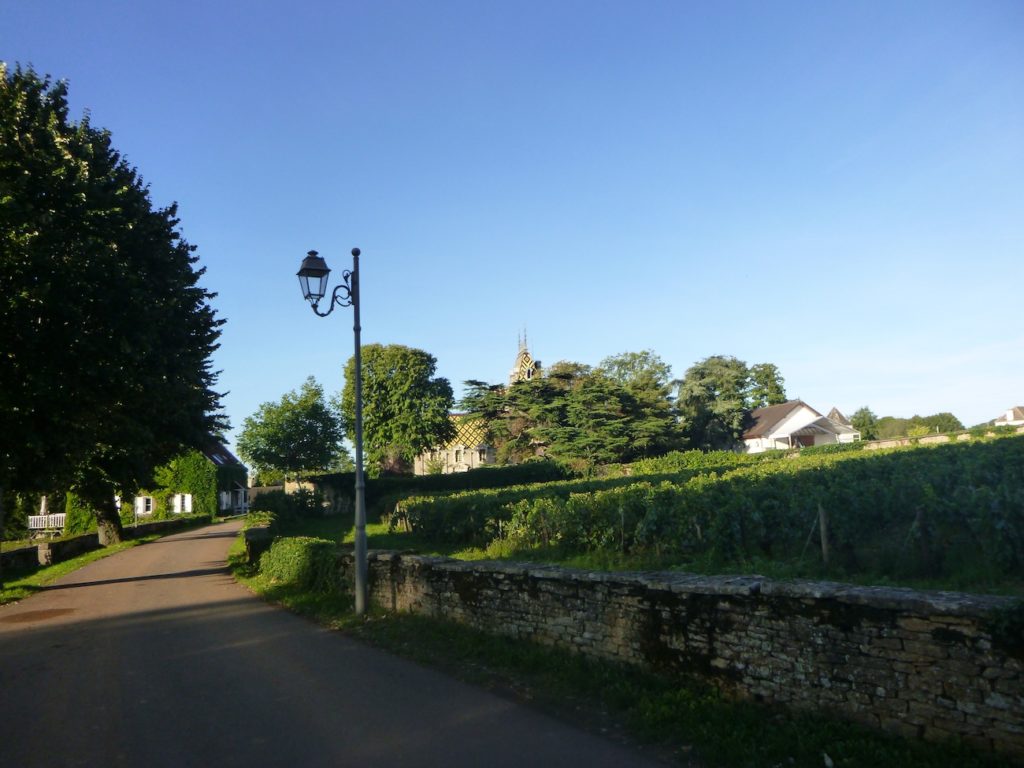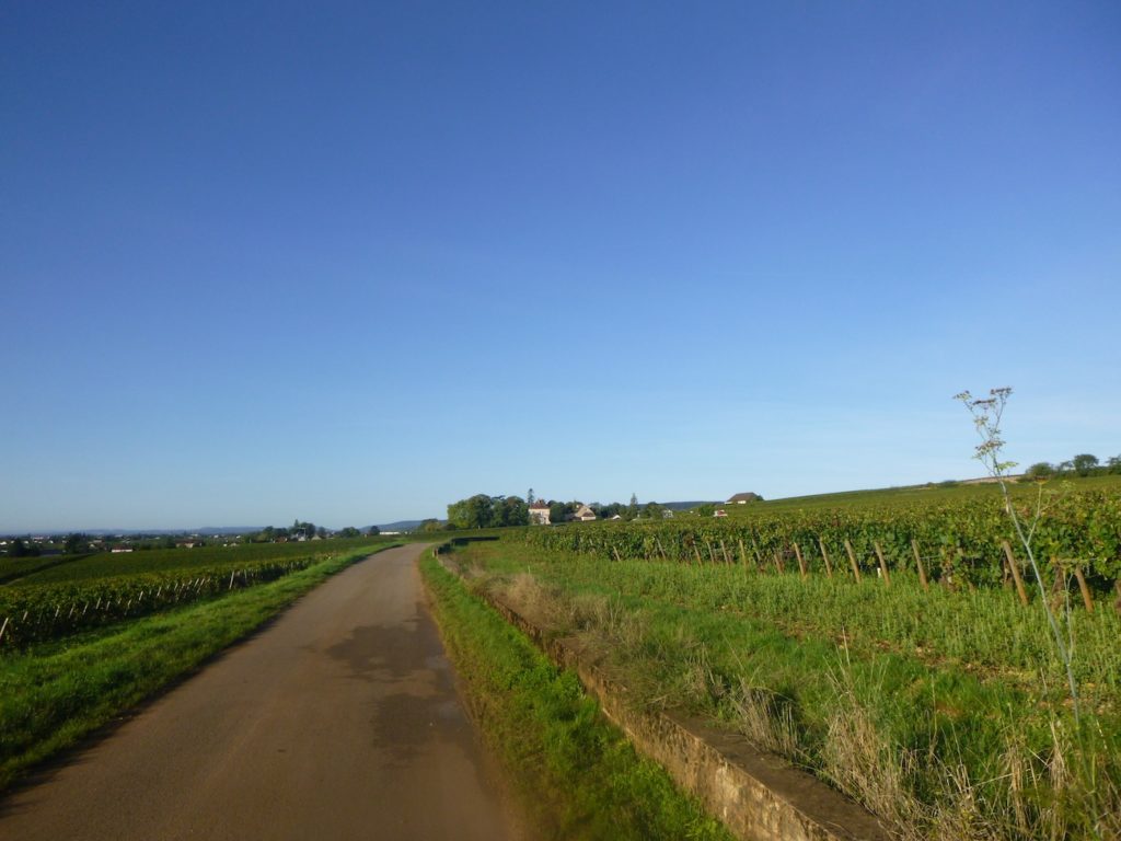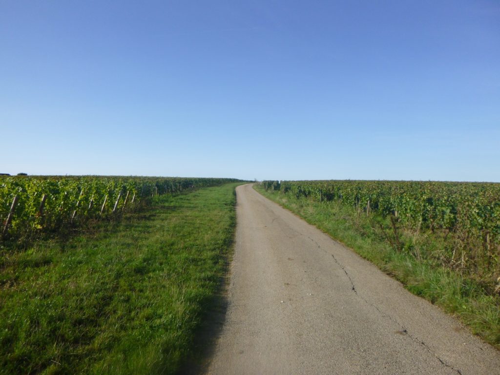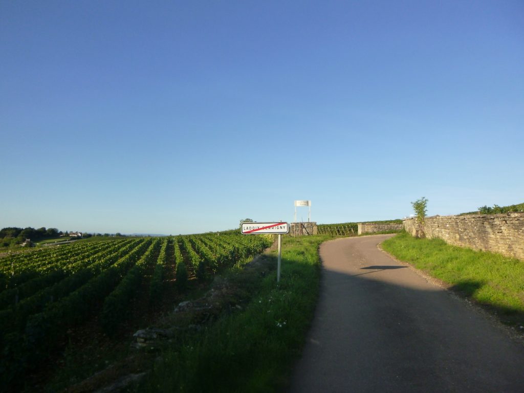 The road then softens and continues to rise gently above the village of Ladoix, still surrounded by vines spreading out like a golden checkerboard.