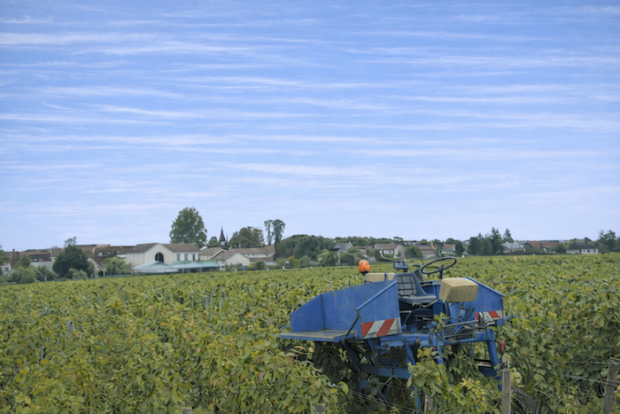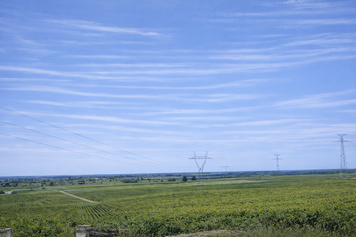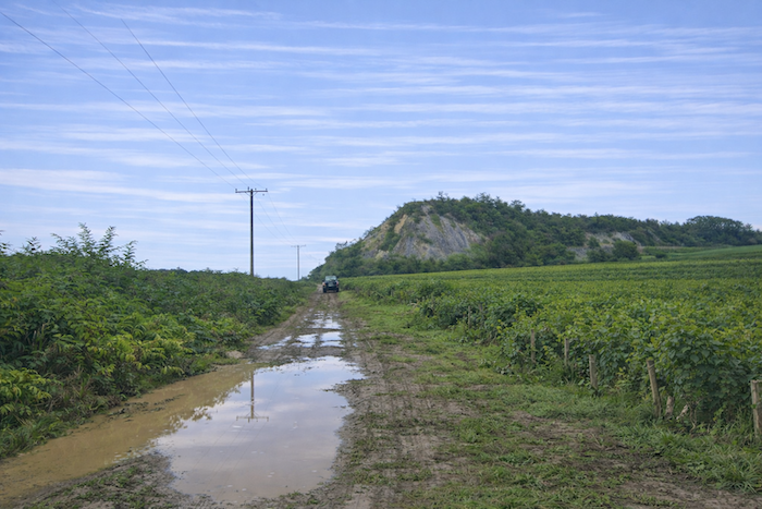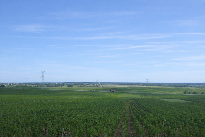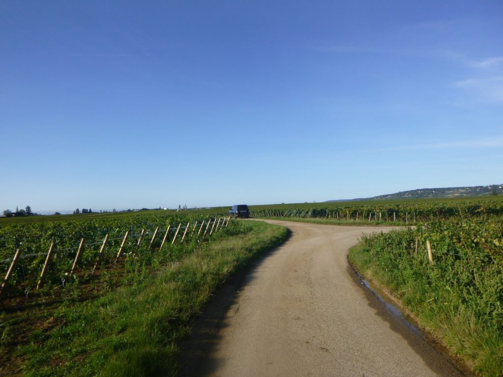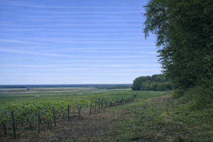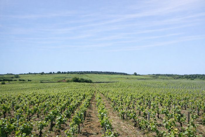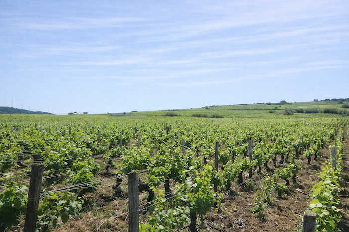 The vines stretch from the hilltop down into the plain, where the departmental road runs.