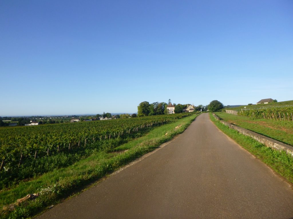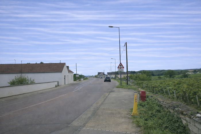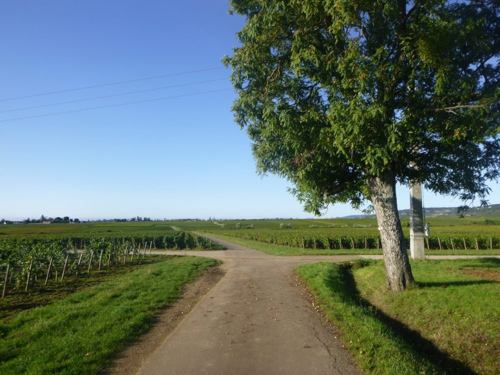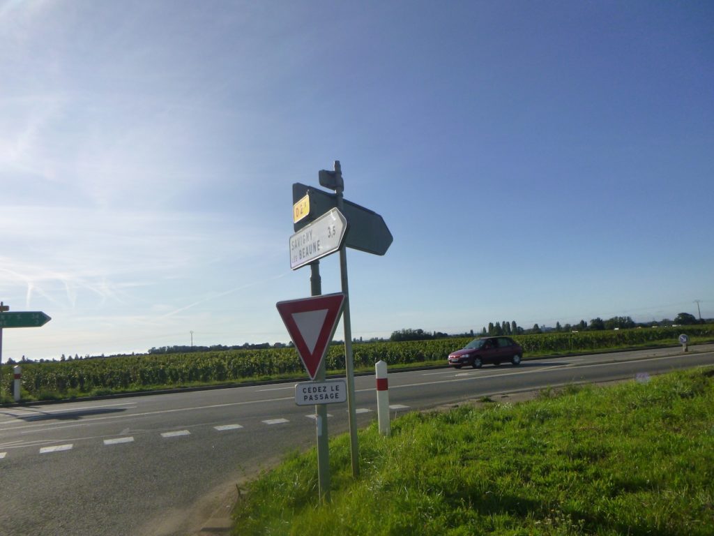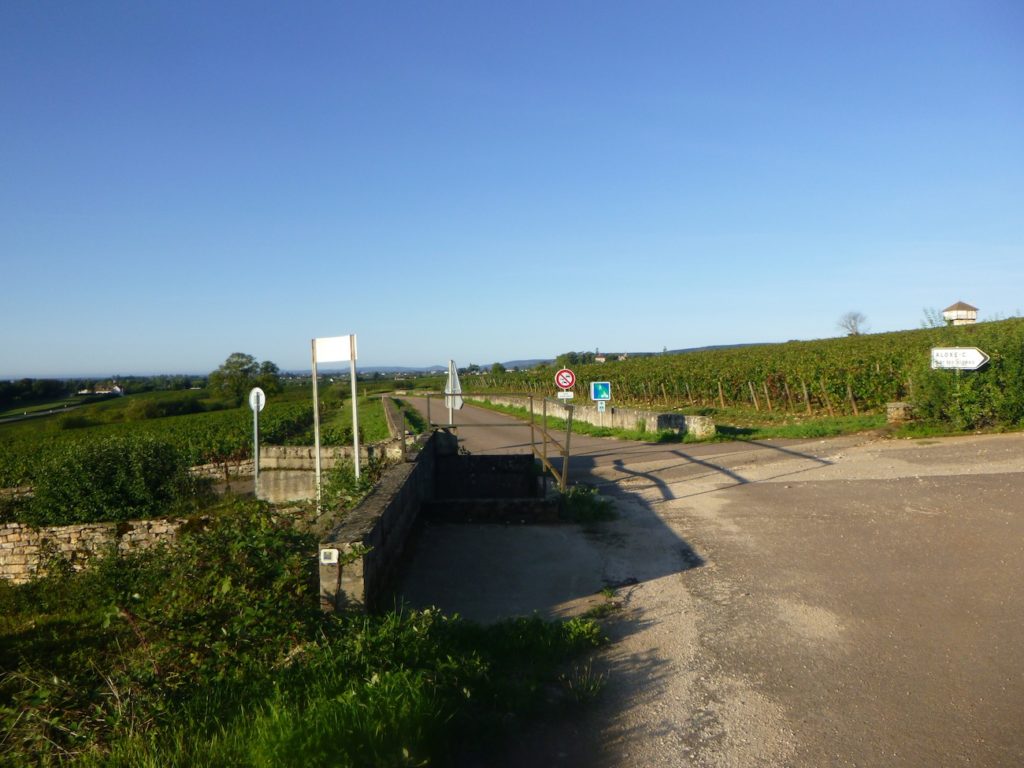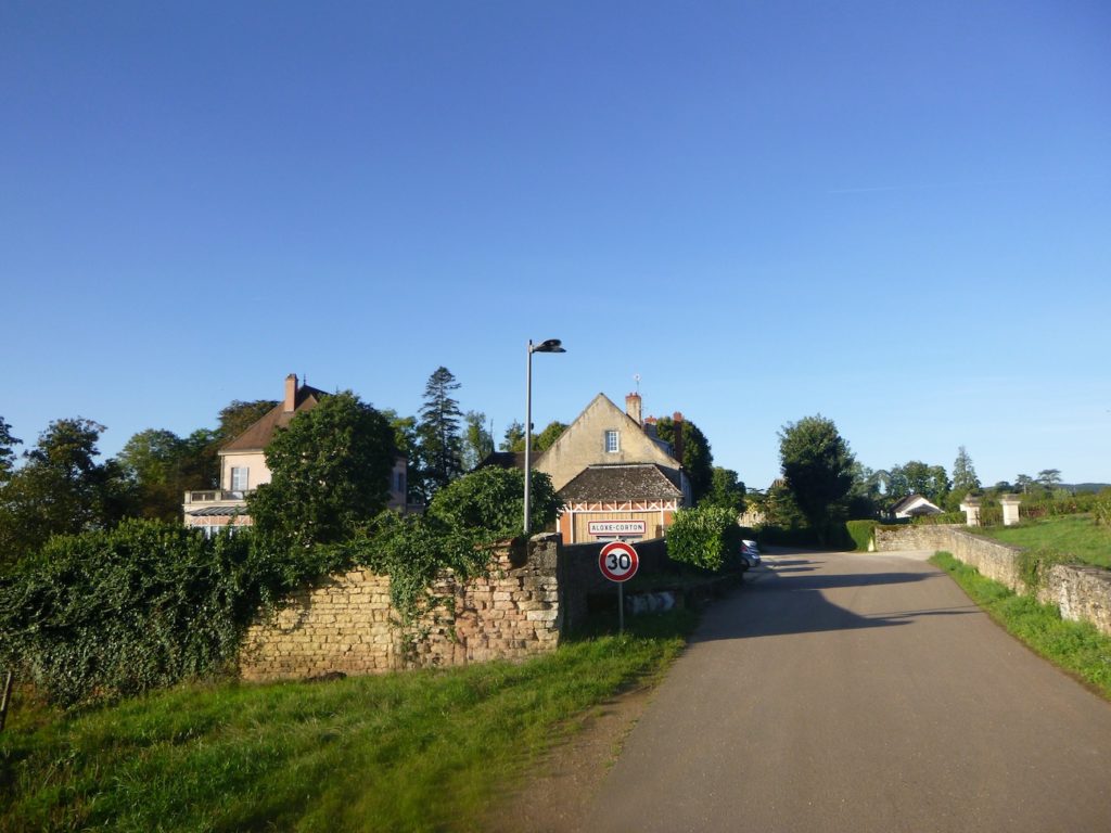 At the end of this long straight line, the road reaches a crossroads at the entrance to Aloxe-Corton.