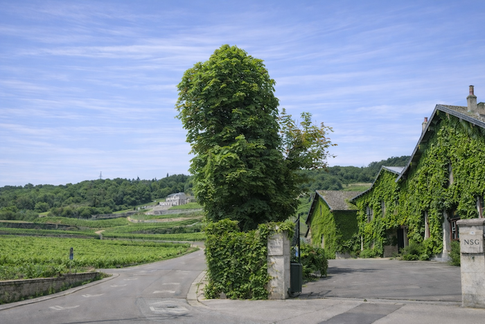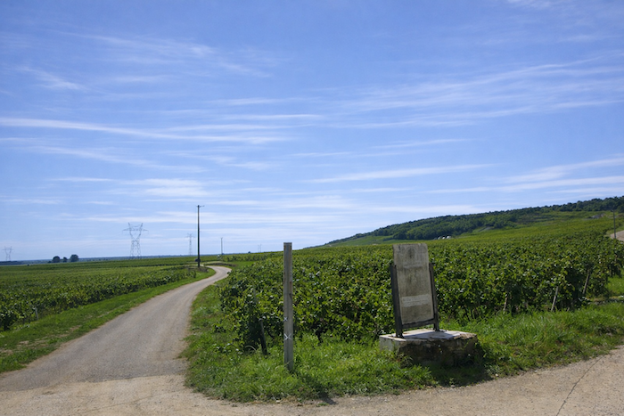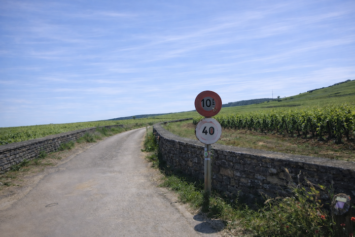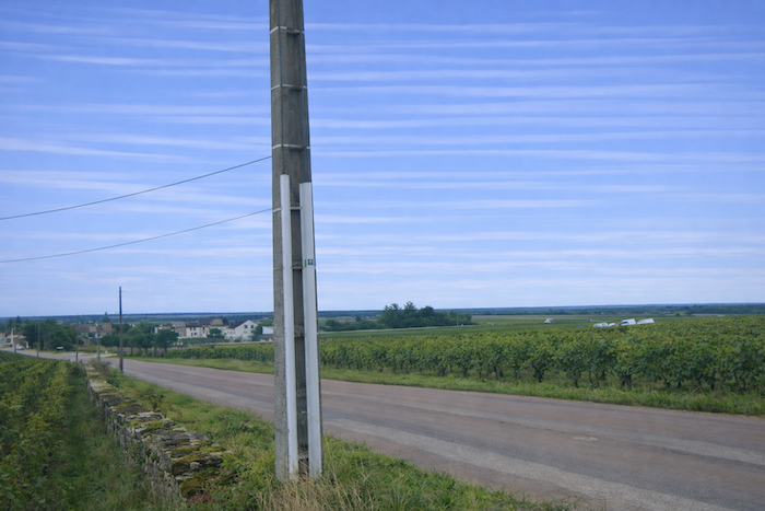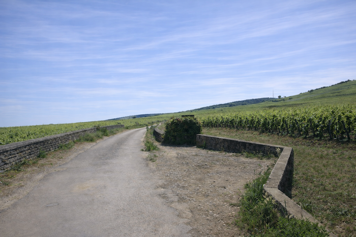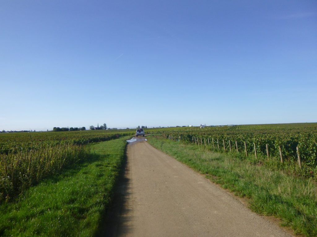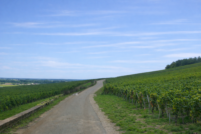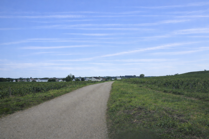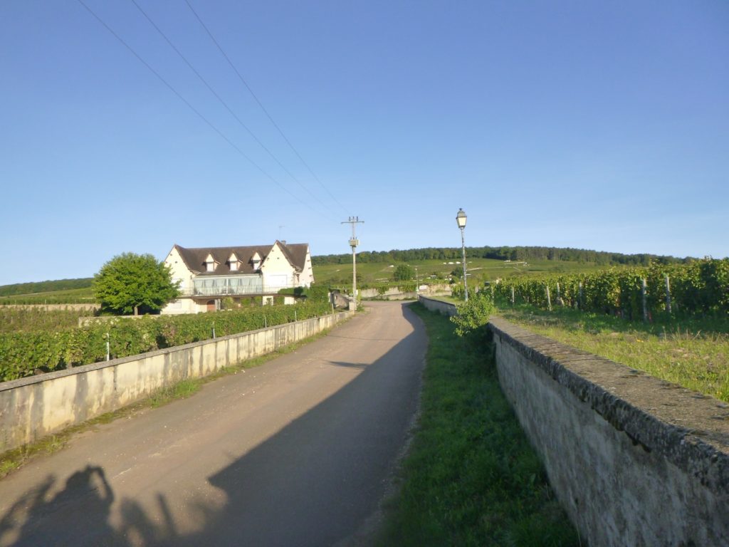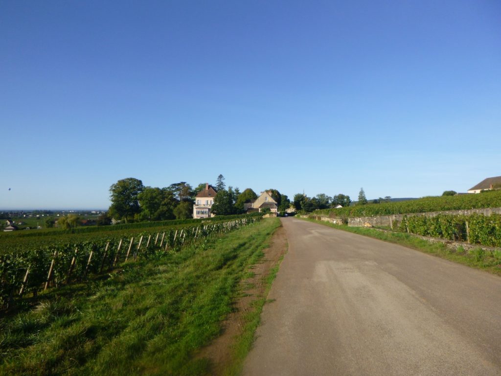 At the end of this long straight line, the road reaches a crossroads at the entrance to Aloxe-Corton.