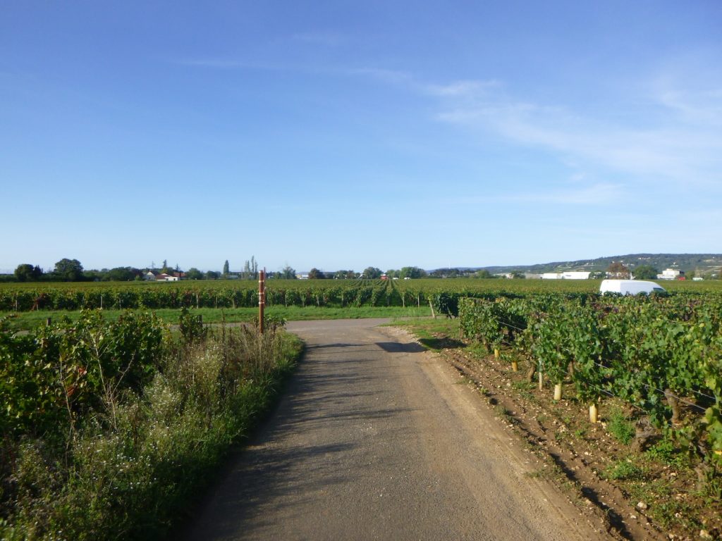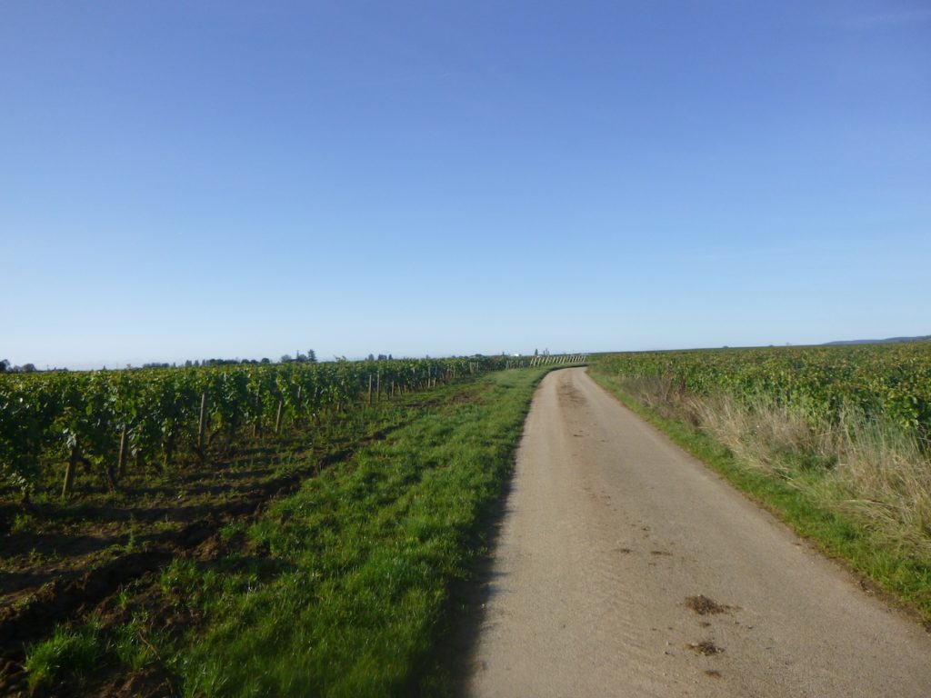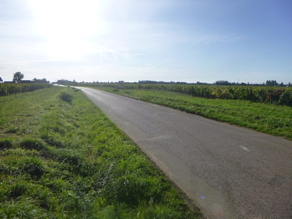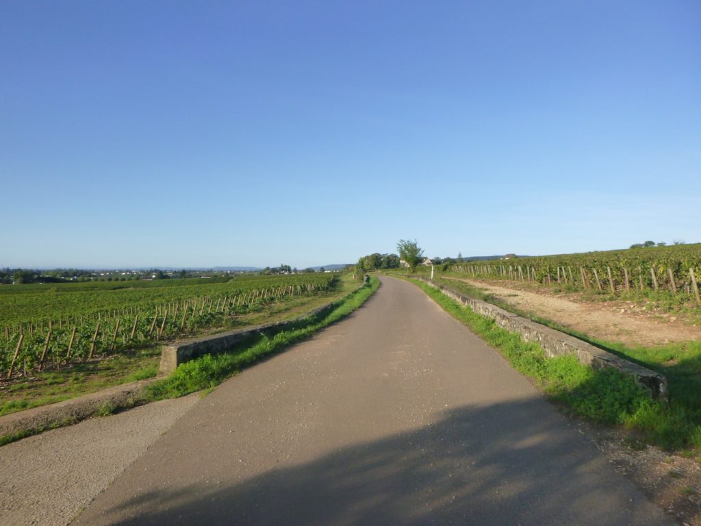 The route then follows, for a few hundred meters, the cycle path stretching straight ahead, gliding like a discreet thread between the rows of vines.