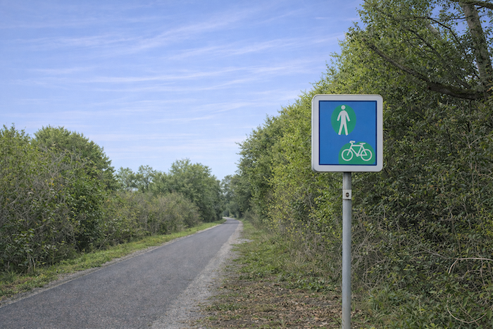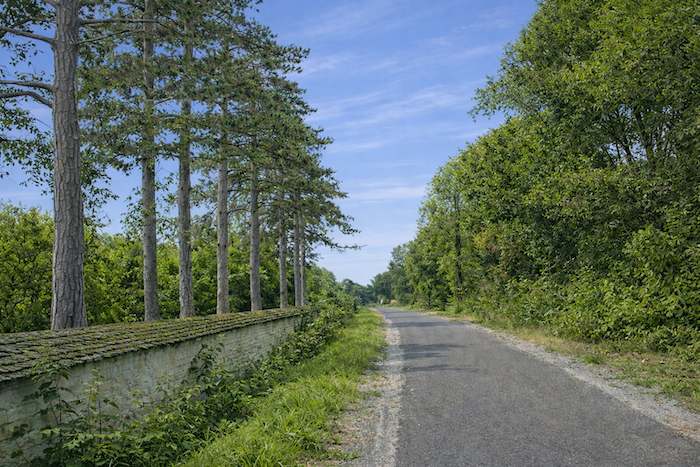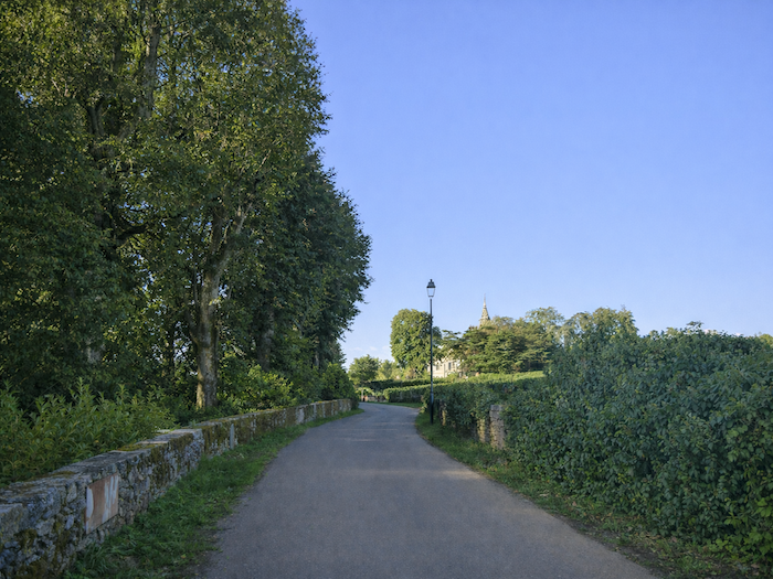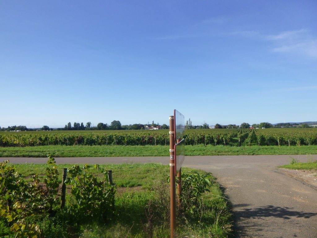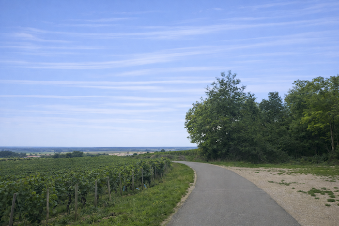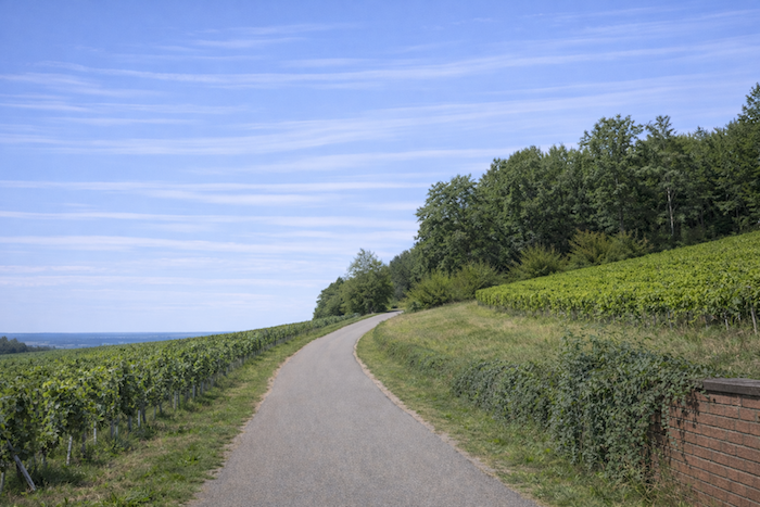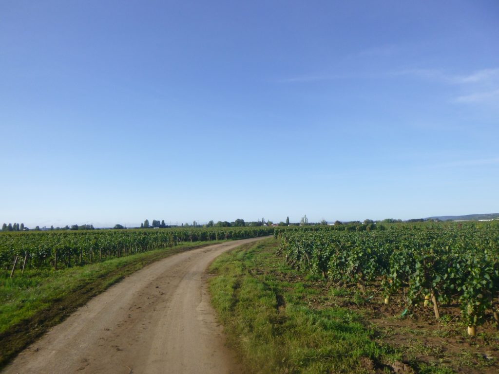The route then follows, for a few hundred meters, the cycle path stretching straight ahead, gliding like a discreet thread between the rows of vines.