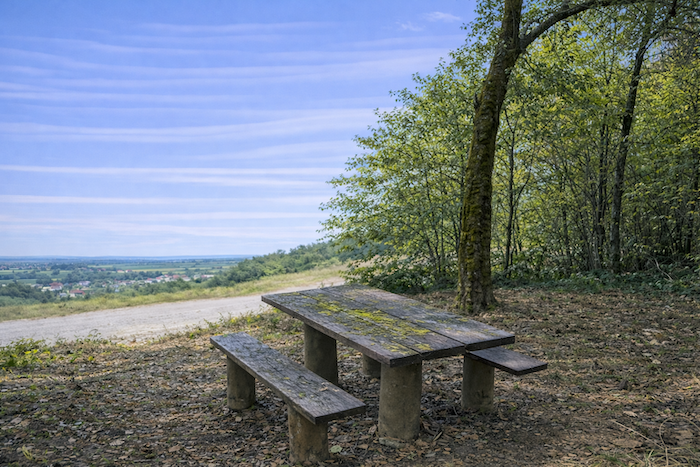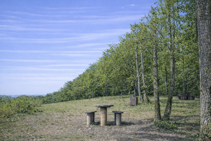 A rest area awaits walkers and cyclists beneath the generous shade of the trees. It is a welcoming pause, a place to sit and contemplate the landscape before gently descending into the valley.