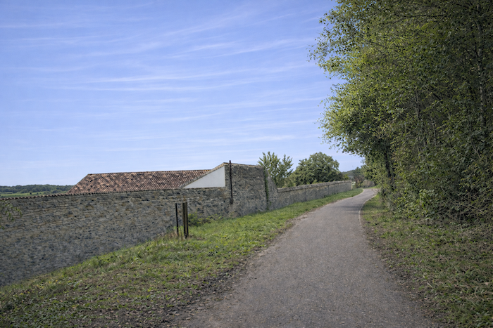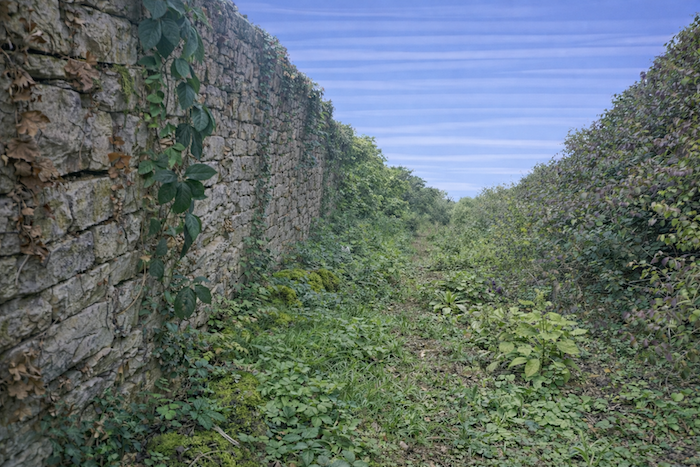 Soon, the path approaches a vast wine estate enclosed by high dry-stone walls. The enclosure commands respect, like a fortress devoted to wine. The path continues humbly along the wall, through grass and untamed vegetation, brushing the edge of the woodland.