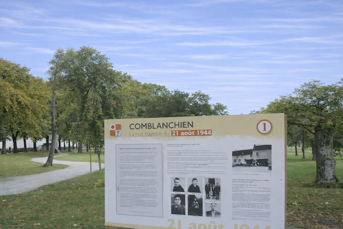 There, a scallop shell indicates the correct direction, toward the cemetery of Corgoloin. The sign is clear and almost reassuring at the threshold of this place of silence and memory.