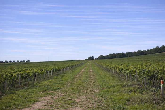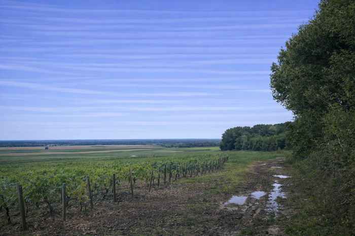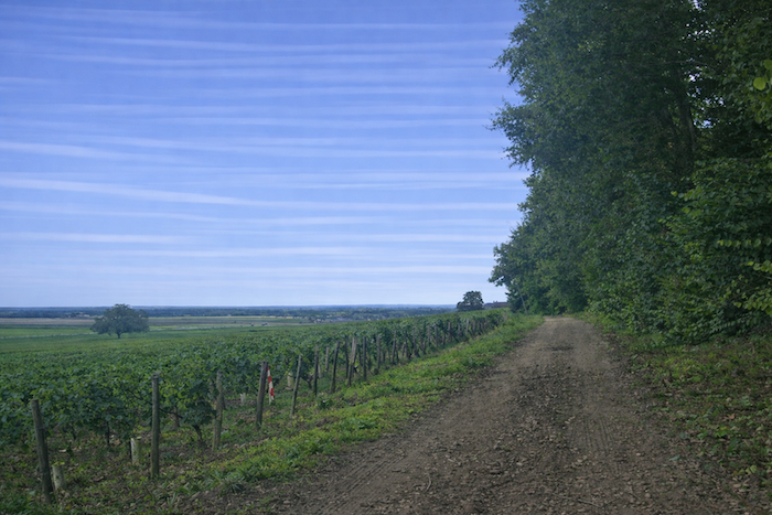 The small road then crosses the vineyard on a gentle slope. It winds like a drowsy serpent among the vines, tracing soft curves through a landscape that opens wide. On the horizon, the rows of vines gradually give way to the promise of a woodland edge, a distant green boundary.