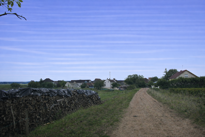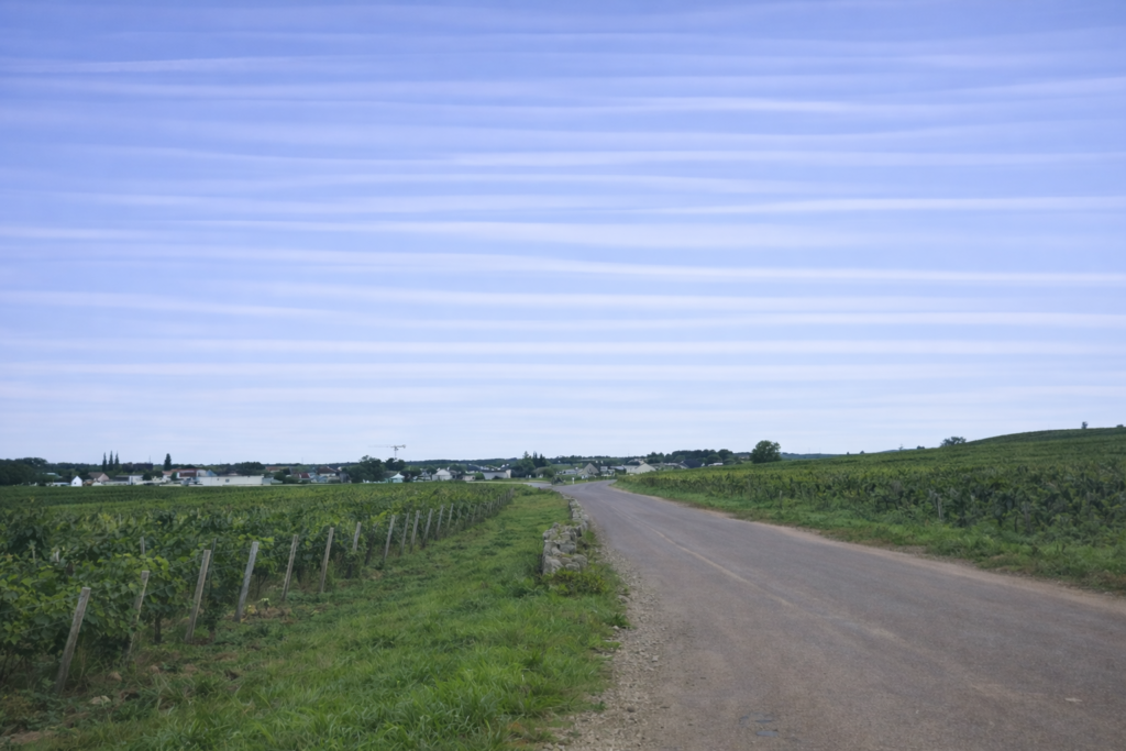 At the lower end of Quai Fleury, the route quickly leaves the town. Here, the Friends of Compostela have not marked the path, yet the attentive walker will recognize the turning. The first narrow street on the right, Rue de Chaux, just after the bridge, leads straight toward the vineyards. There, another adventure begins, between rows of vines aligned like a disciplined army and a sky stretching endlessly above.