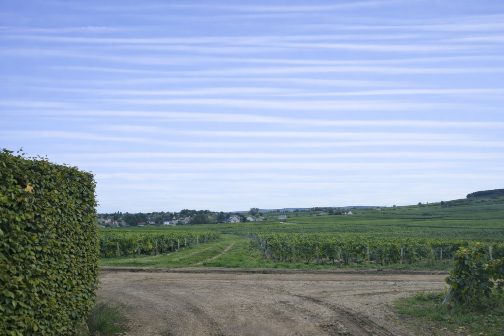 It is a dirt path, bordered by carefully aligned vines, that leads you to the upper entrance of Ladoix-Serrigny. Here, the vineyard stretches like a sea of vine shoots, vibrating in the light breeze, and opens the way toward the village.