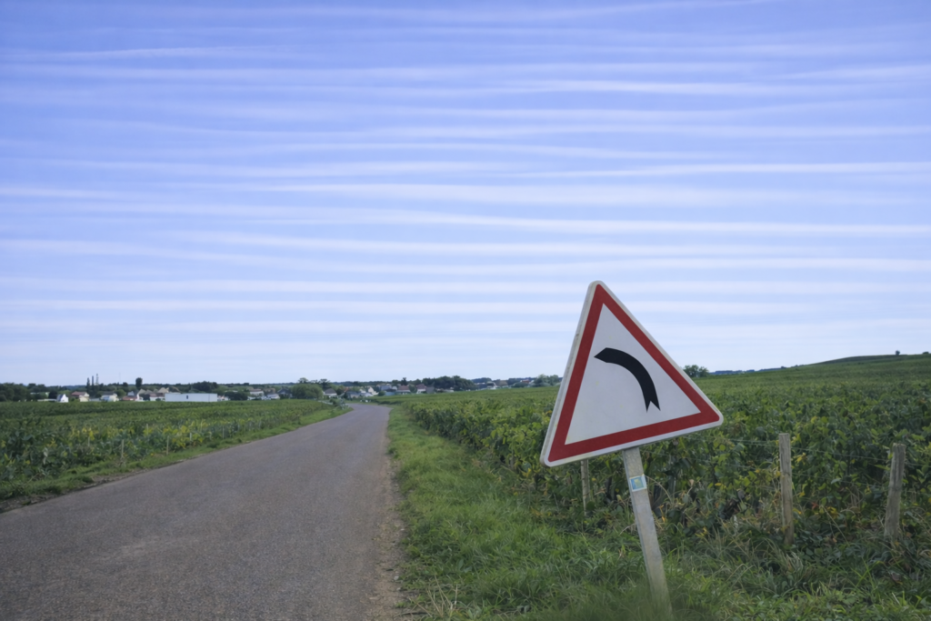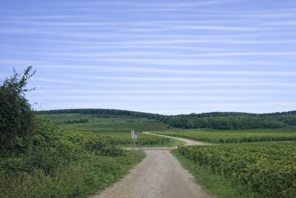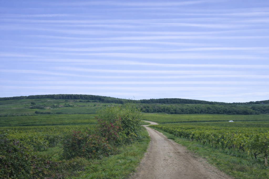 Soon after, another junction appears, bringing with it the same dilemma. No scallop indicates the way. Right or left? You tell yourself that the route is kind, that it will surely spare you the effort of climbing to the summit of the Corton hill, high above. So, you choose the gentle, smooth path opening to the left, a line that seems to flow naturally, like an invitation. And that is indeed the right choice.
