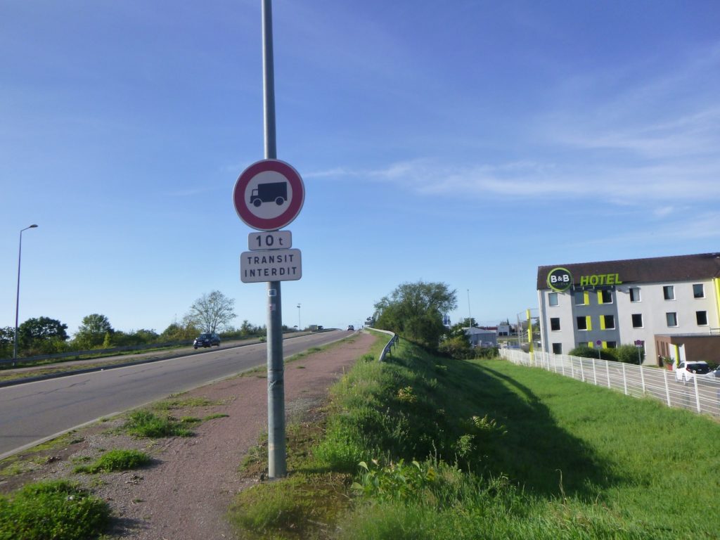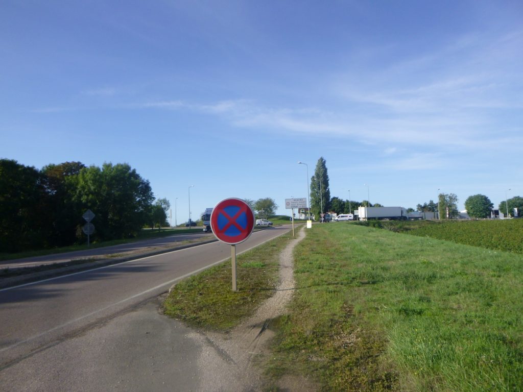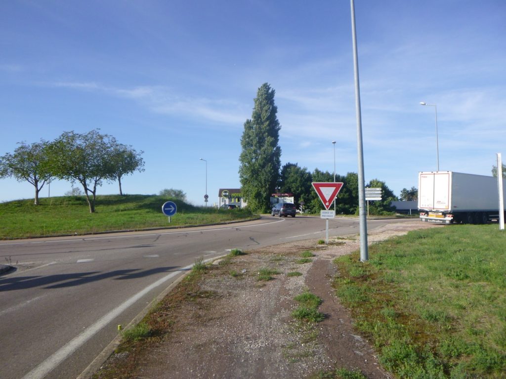 You must now follow the road, where the constant roar of vehicles reminds you that the peaceful countryside is behind you. Road signs soon announce the proximity of the motorway.