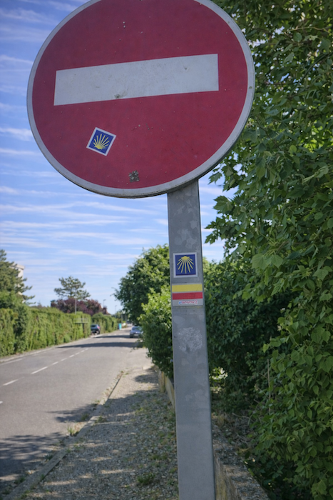 The street descends in a straight line into the outskirts of the town, as clearly indicated, for once, by a well-placed scallop shell.