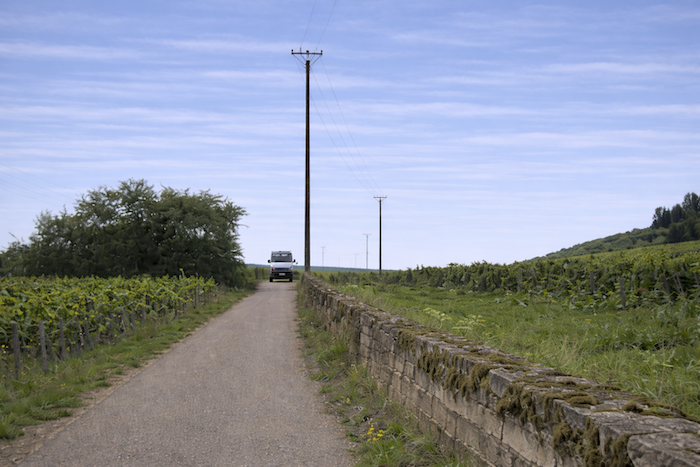 Further on, the road slopes up gently, without harshness. The stone walls lining it, sometimes collapsed, sometimes standing proudly, mark the boundaries of the parcels, as if to signal the importance of the crus they enclose. Behind these stones lie, no doubt, more prestigious “climats”, jealously preserved through generations.