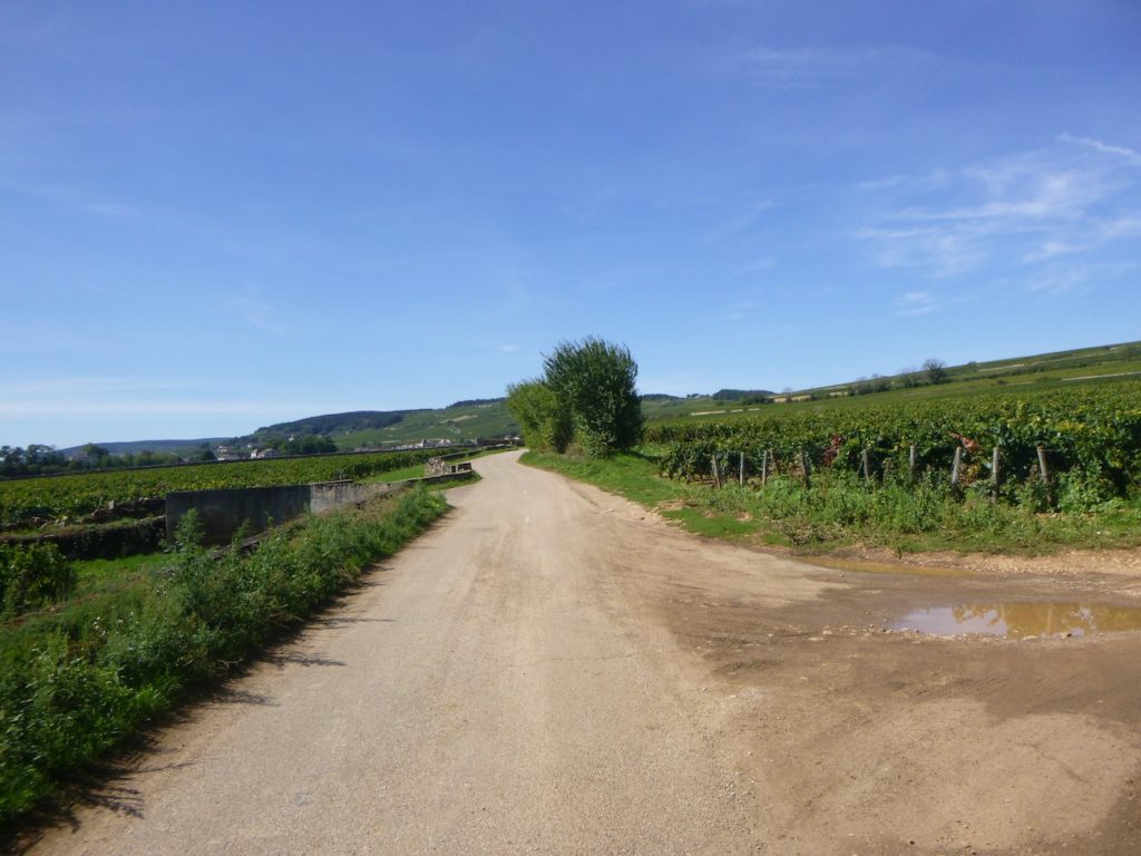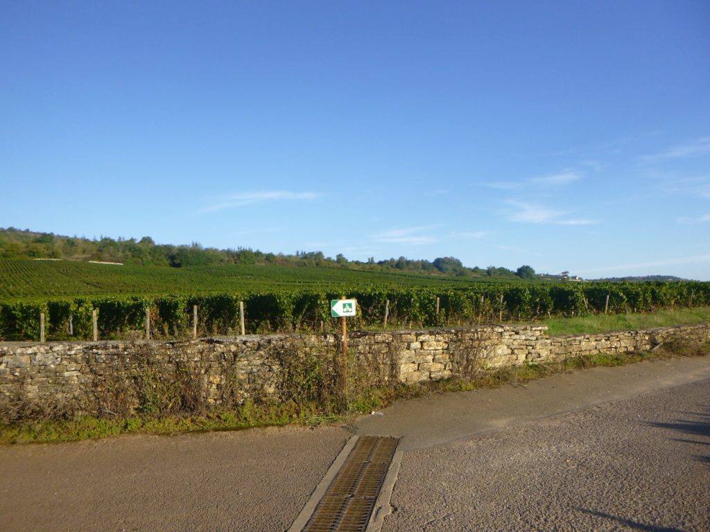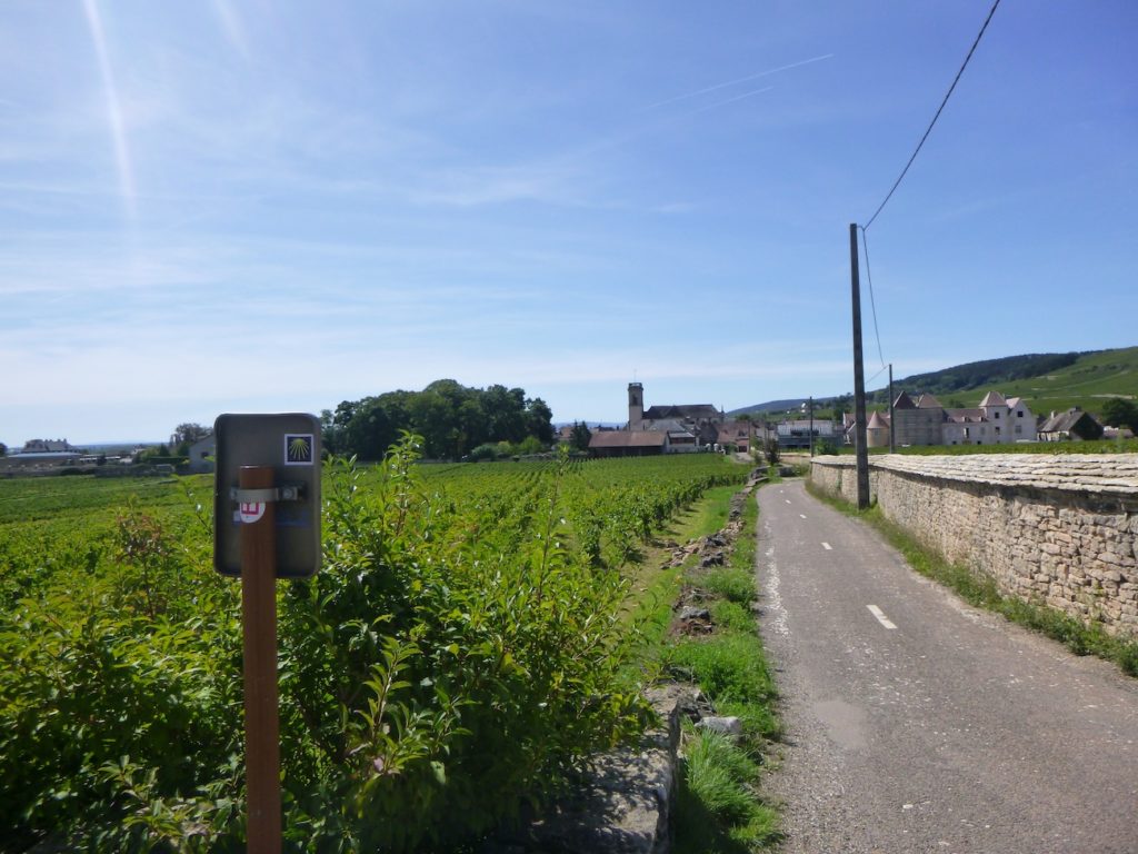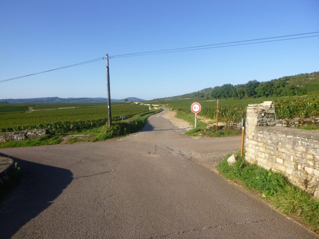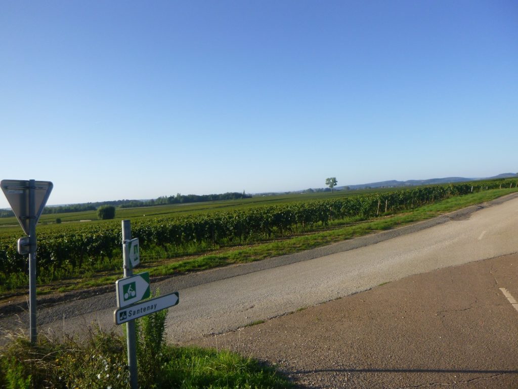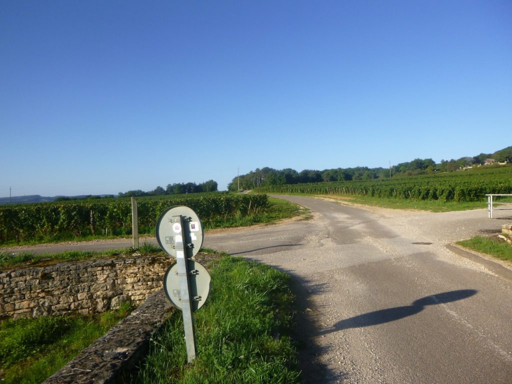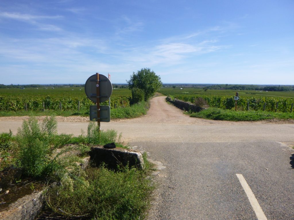 Elle débouche enfin sur un carrefour de routes. Là, un choix se présente : continuer tout droit, et l’on se dirige vers Chassagne-Montrachet. Ce parcours mène plus loin encore, jusqu’à Rémigny, avant d’atteindre Chagny, mais c’est un très long détour. L’alternative, plus clémente, est de suivre la variante vers Puligny-Montrachet, également jalonnée de coquilles. Le pèlerin hésite alors : est-il un amoureux inconditionnel des vignes, prêt à prolonger son effort, ou préfère-t-il ménager ses jambes et son souffle ? Et il y a raison à ce choix : cette variante permet de rejoindre directement Chagny, avec un gain d’environ de plus de 5 kilomètres.