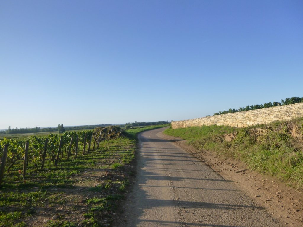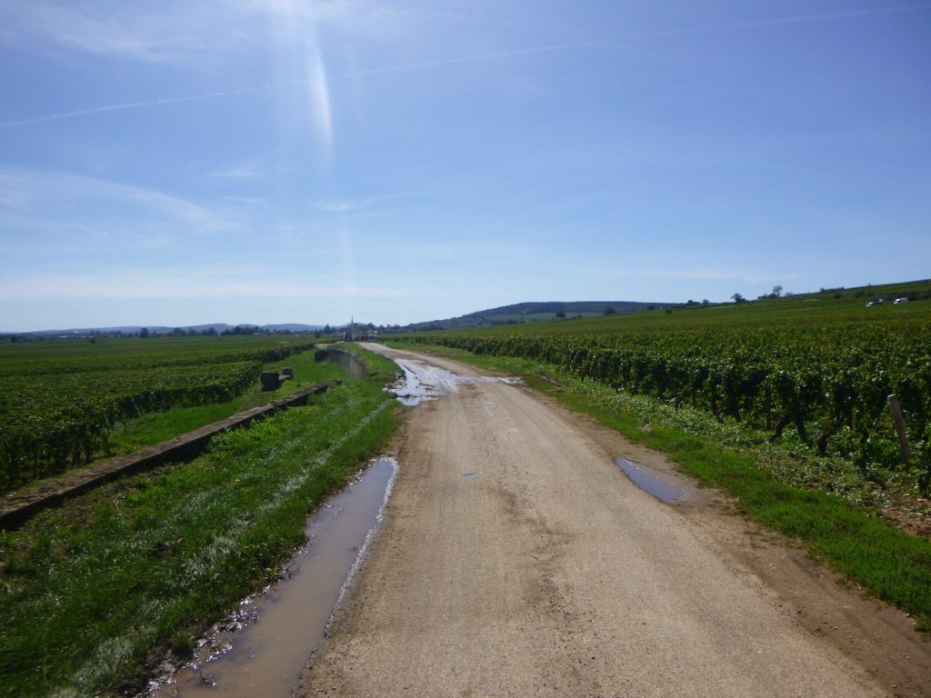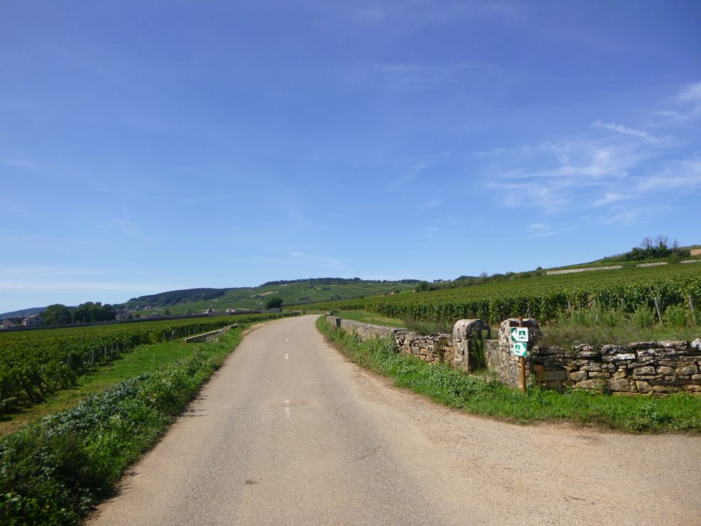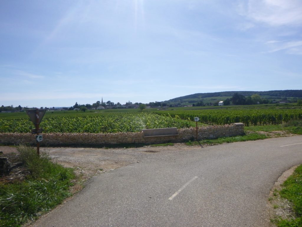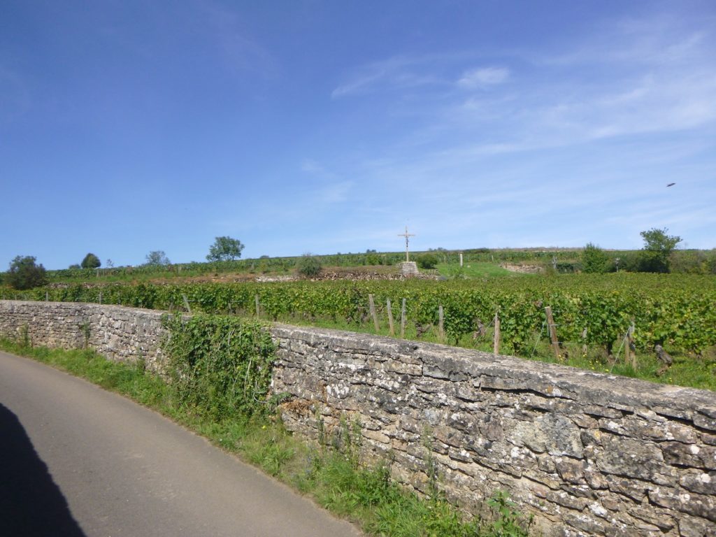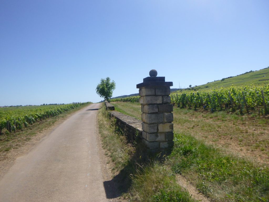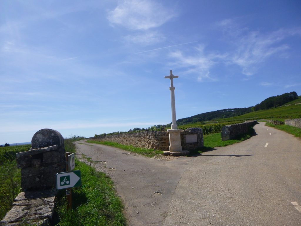 Elle débouche enfin sur un carrefour de routes. Là, un choix se présente : continuer tout droit, et l’on se dirige vers Chassagne-Montrachet. Ce parcours mène plus loin encore, jusqu’à Rémigny, avant d’atteindre Chagny, mais c’est un très long détour. L’alternative, plus clémente, est de suivre la variante vers Puligny-Montrachet, également jalonnée de coquilles. Le pèlerin hésite alors : est-il un amoureux inconditionnel des vignes, prêt à prolonger son effort, ou préfère-t-il ménager ses jambes et son souffle ? Et il y a raison à ce choix : cette variante permet de rejoindre directement Chagny, avec un gain d’environ de plus de 5 kilomètres.