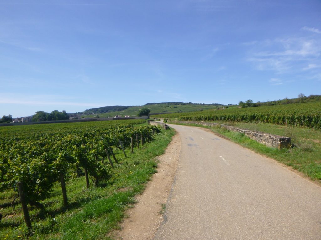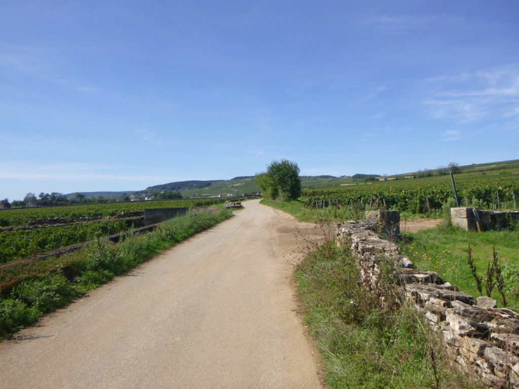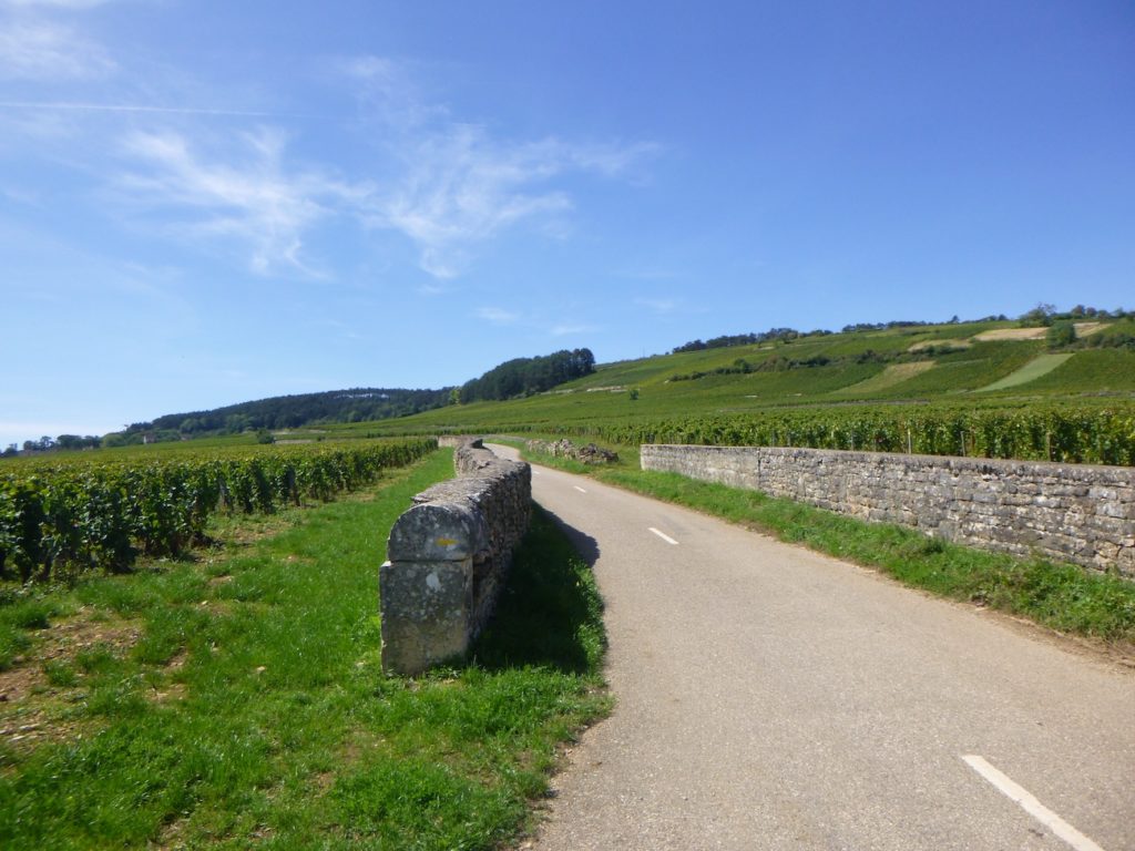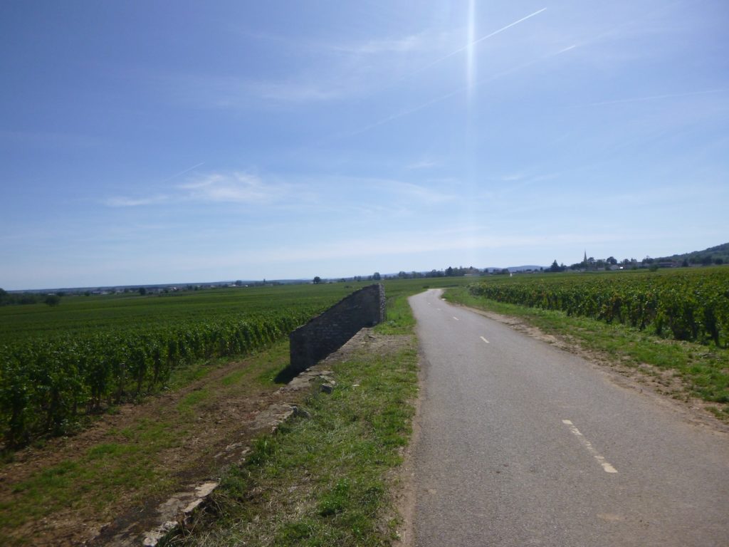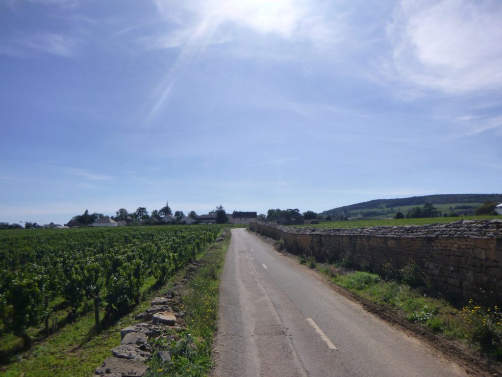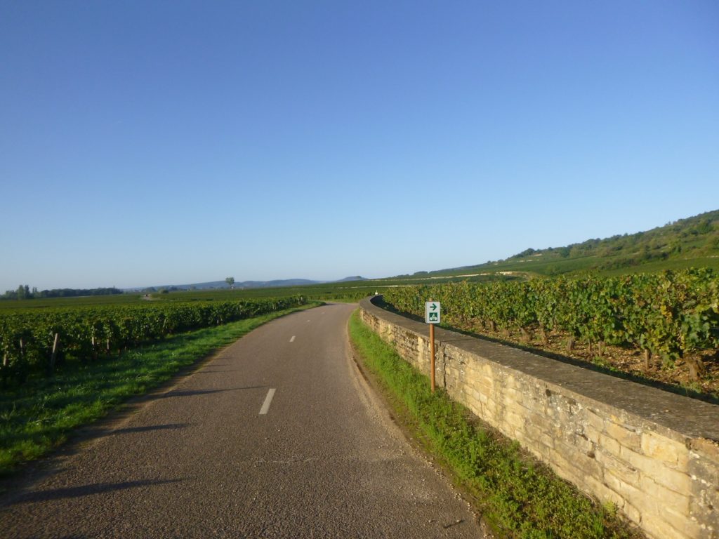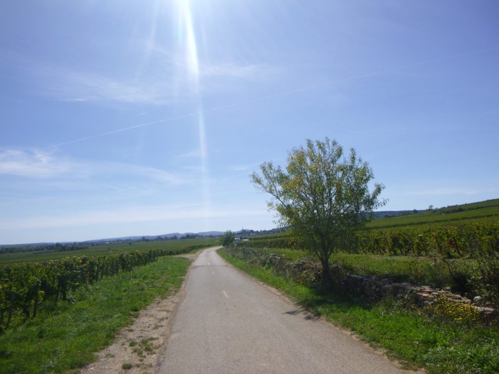 Elle débouche enfin sur un carrefour de routes. Là, un choix se présente : continuer tout droit, et l’on se dirige vers Chassagne-Montrachet. Ce parcours mène plus loin encore, jusqu’à Rémigny, avant d’atteindre Chagny, mais c’est un très long détour. L’alternative, plus clémente, est de suivre la variante vers Puligny-Montrachet, également jalonnée de coquilles. Le pèlerin hésite alors : est-il un amoureux inconditionnel des vignes, prêt à prolonger son effort, ou préfère-t-il ménager ses jambes et son souffle ? Et il y a raison à ce choix : cette variante permet de rejoindre directement Chagny, avec un gain d’environ de plus de 5 kilomètres.