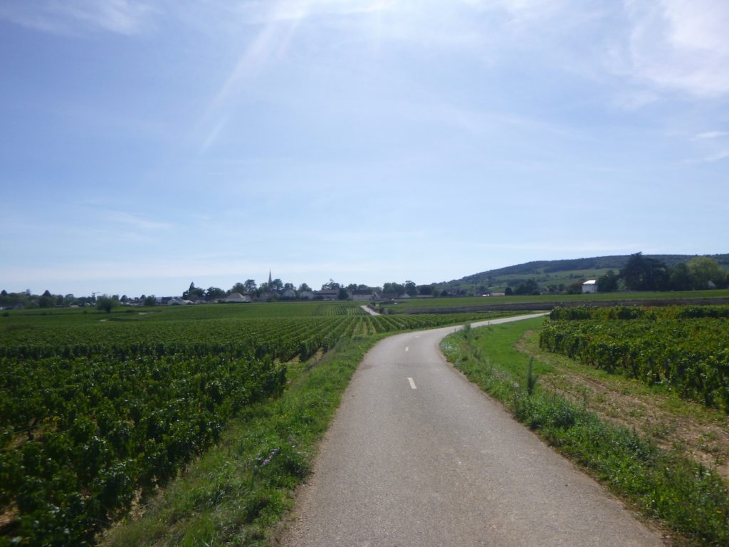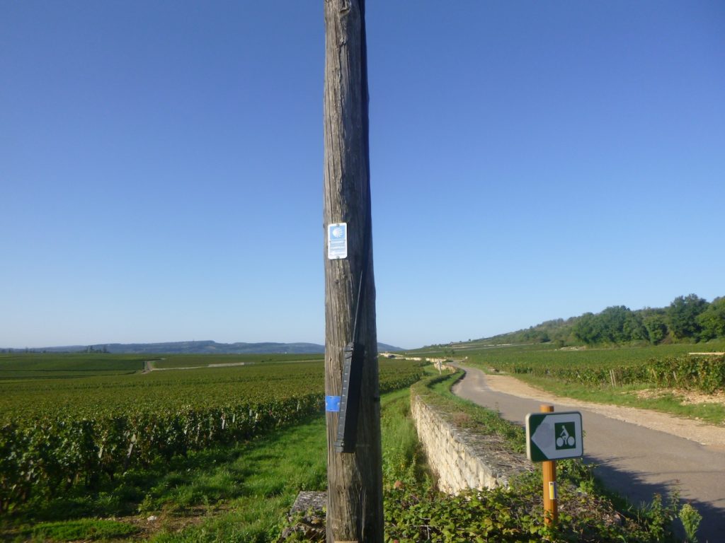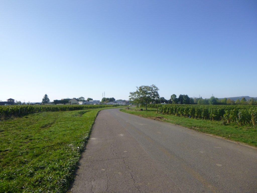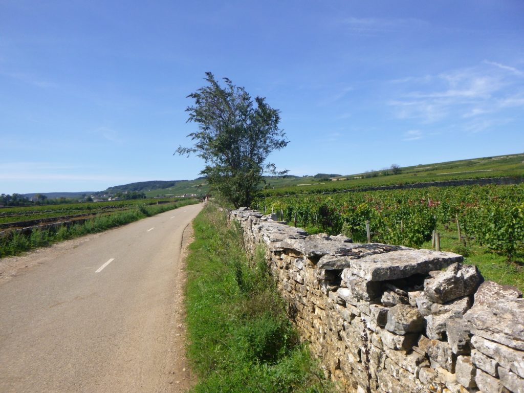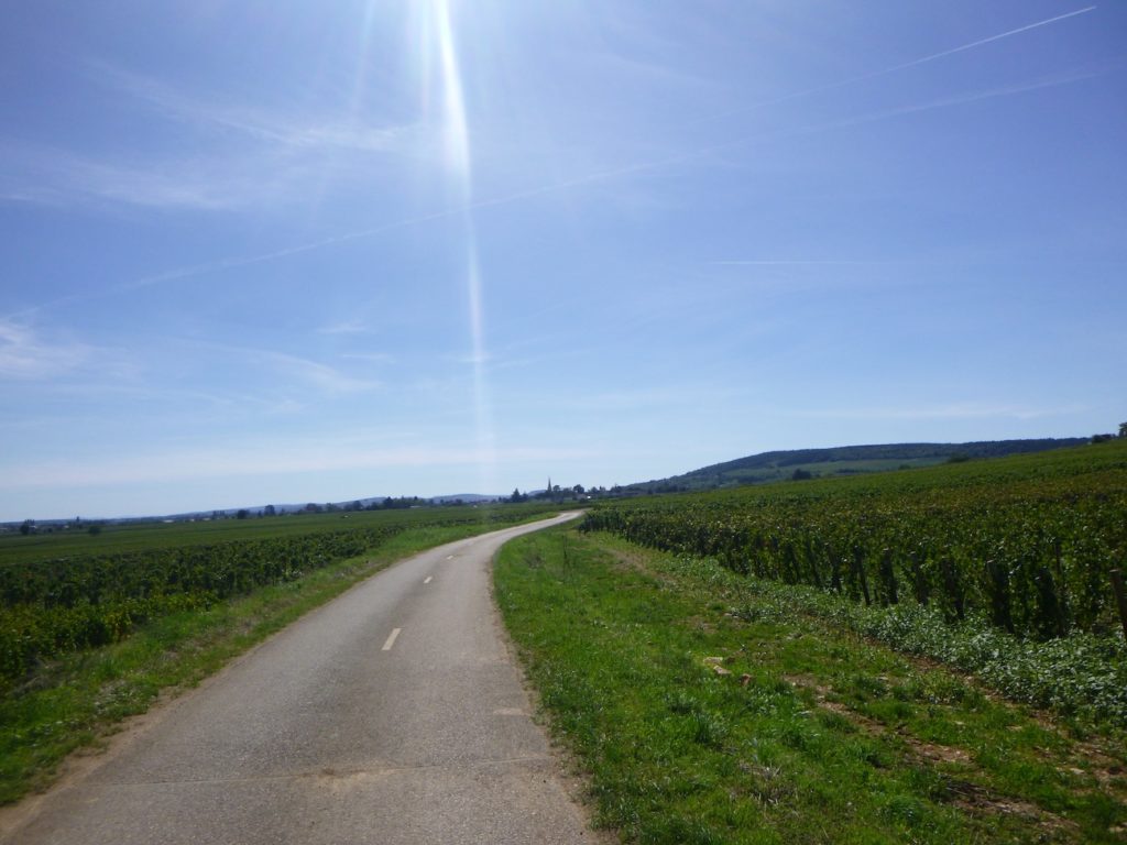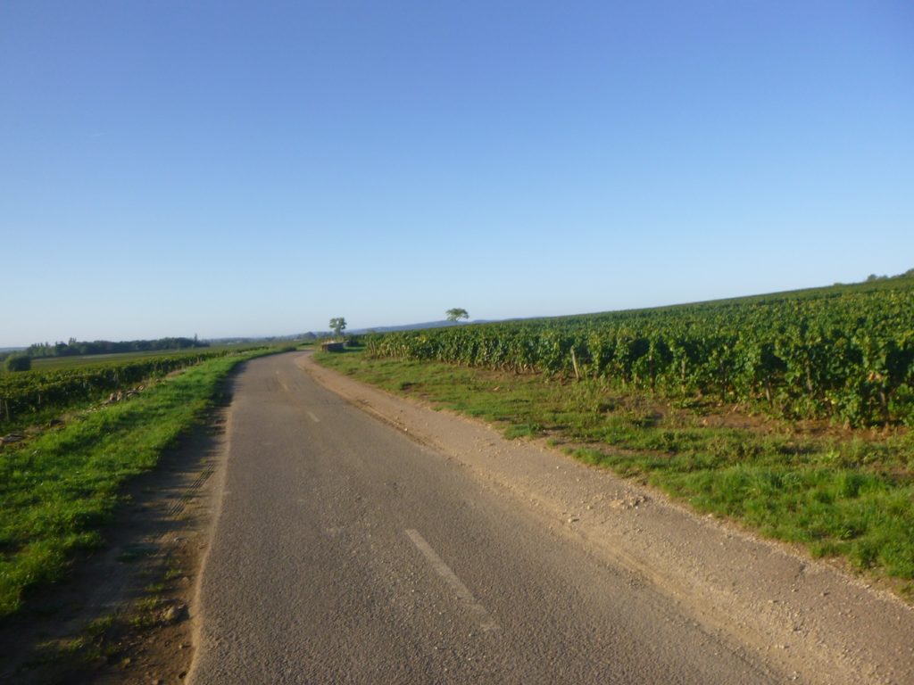 Elle débouche enfin sur un carrefour de routes. Là, un choix se présente : continuer tout droit, et l’on se dirige vers Chassagne-Montrachet. Ce parcours mène plus loin encore, jusqu’à Rémigny, avant d’atteindre Chagny, mais c’est un très long détour. L’alternative, plus clémente, est de suivre la variante vers Puligny-Montrachet, également jalonnée de coquilles. Le pèlerin hésite alors : est-il un amoureux inconditionnel des vignes, prêt à prolonger son effort, ou préfère-t-il ménager ses jambes et son souffle ? Et il y a raison à ce choix : cette variante permet de rejoindre directement Chagny, avec un gain d’environ de plus de 5 kilomètres.
