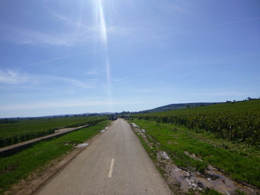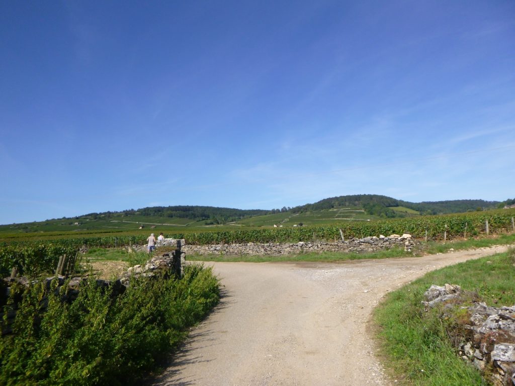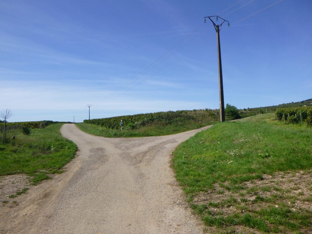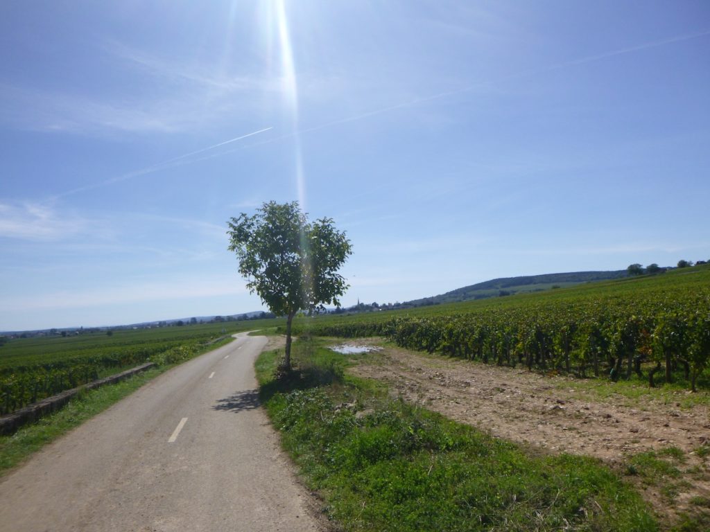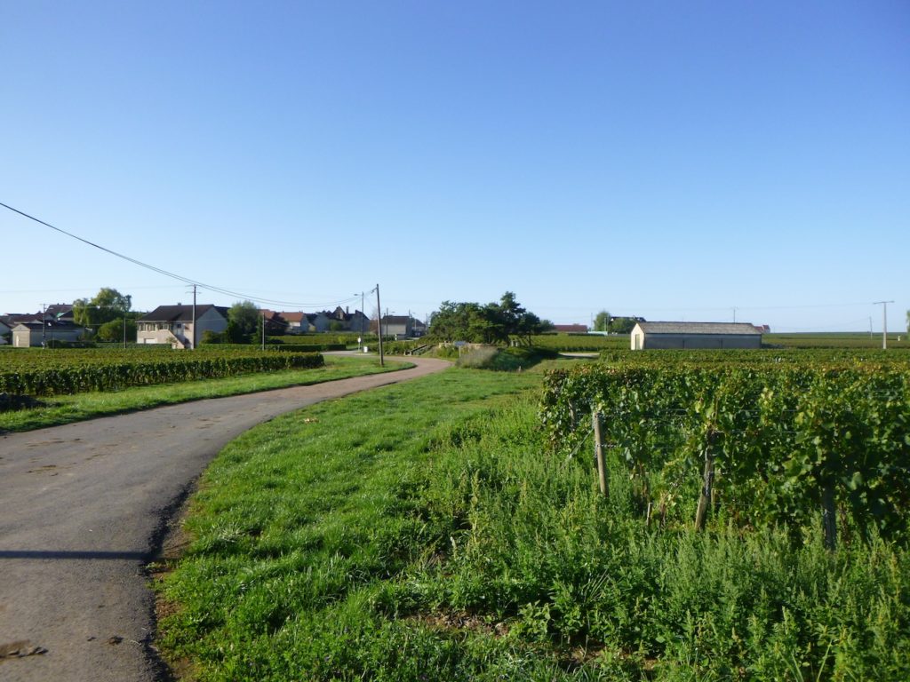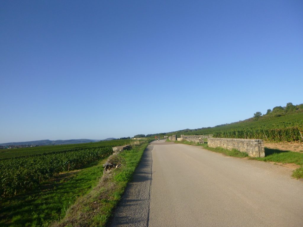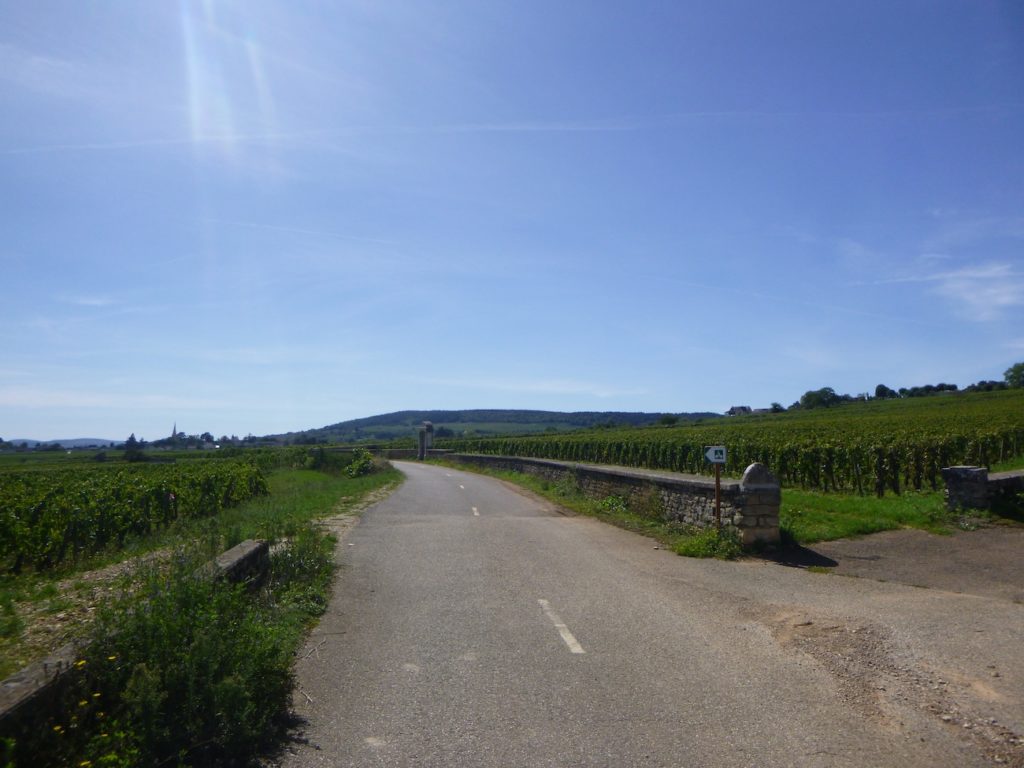 Elle débouche enfin sur un carrefour de routes. Là, un choix se présente : continuer tout droit, et l’on se dirige vers Chassagne-Montrachet. Ce parcours mène plus loin encore, jusqu’à Rémigny, avant d’atteindre Chagny, mais c’est un très long détour. L’alternative, plus clémente, est de suivre la variante vers Puligny-Montrachet, également jalonnée de coquilles. Le pèlerin hésite alors : est-il un amoureux inconditionnel des vignes, prêt à prolonger son effort, ou préfère-t-il ménager ses jambes et son souffle ? Et il y a raison à ce choix : cette variante permet de rejoindre directement Chagny, avec un gain d’environ de plus de 5 kilomètres.