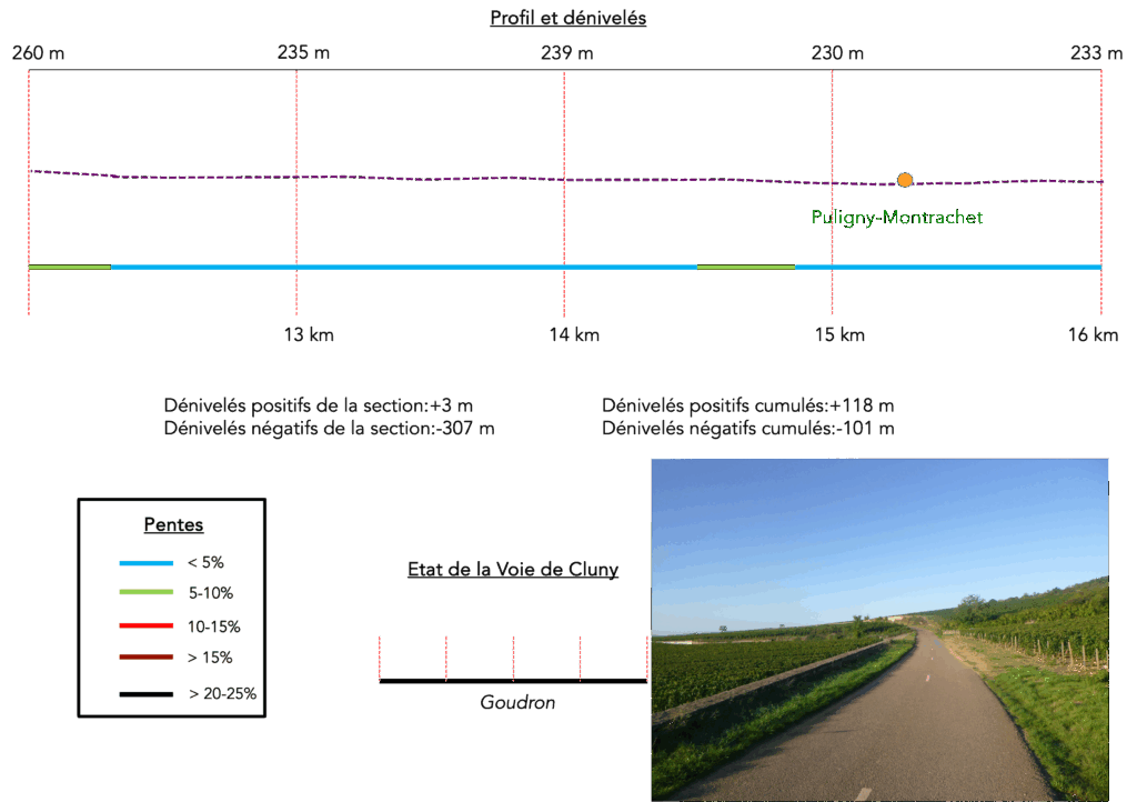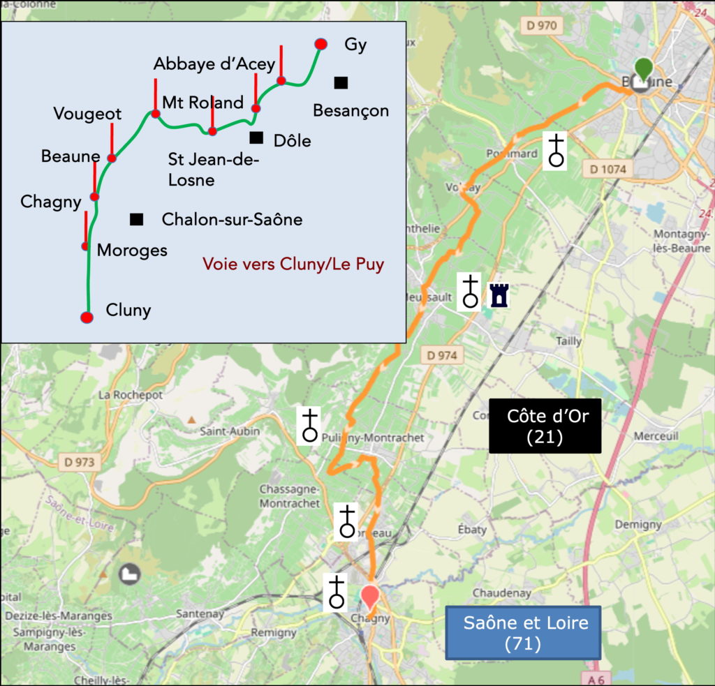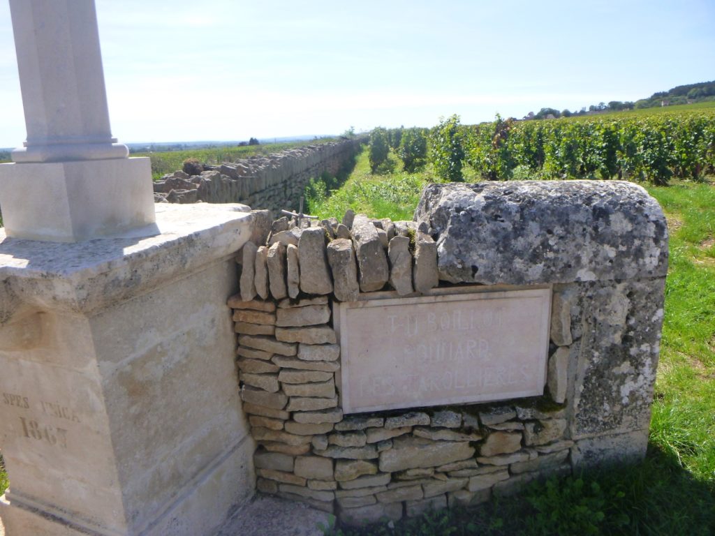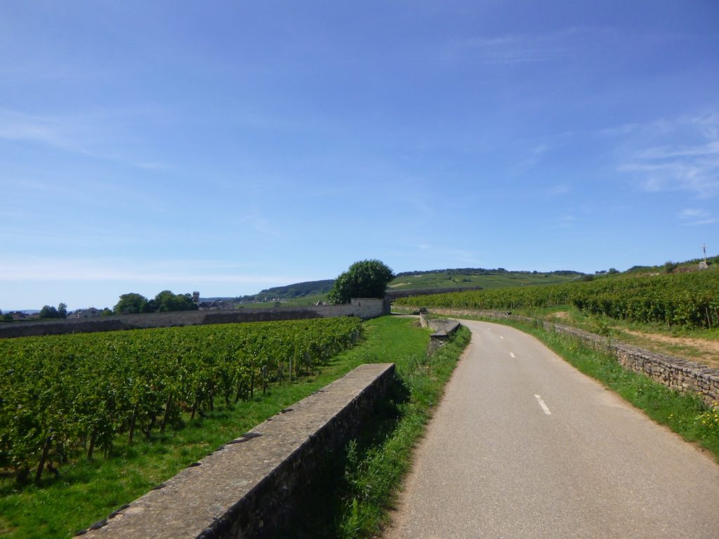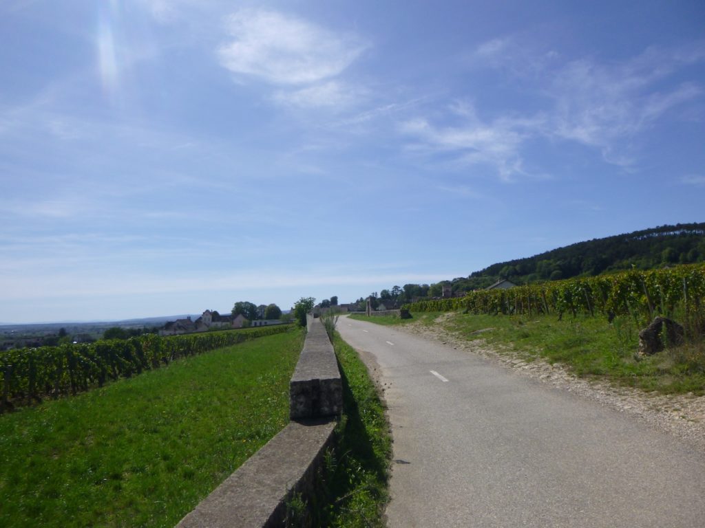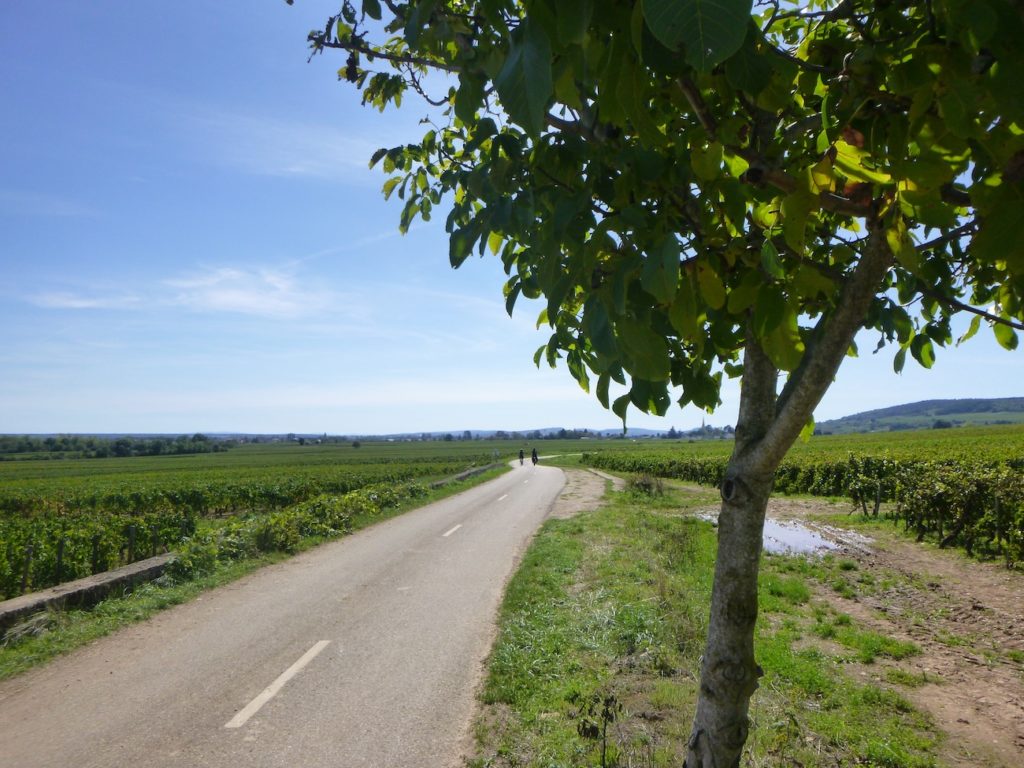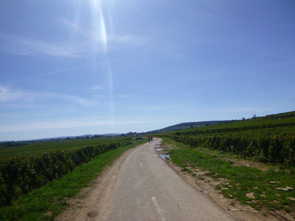 Elle débouche enfin sur un carrefour de routes. Là, un choix se présente : continuer tout droit, et l’on se dirige vers Chassagne-Montrachet. Ce parcours mène plus loin encore, jusqu’à Rémigny, avant d’atteindre Chagny, mais c’est un très long détour. L’alternative, plus clémente, est de suivre la variante vers Puligny-Montrachet, également jalonnée de coquilles. Le pèlerin hésite alors : est-il un amoureux inconditionnel des vignes, prêt à prolonger son effort, ou préfère-t-il ménager ses jambes et son souffle ? Et il y a raison à ce choix : cette variante permet de rejoindre directement Chagny, avec un gain d’environ de plus de 5 kilomètres.