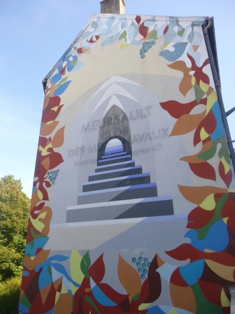 | Ici, le parcours n’est pas fléché : le marcheur, livré à lui-même, pourrait hésiter. Mais qu’on se rassure, le parcours se devine, et nous allons vous guider. Il suffit de traverser le petit parc, paisible comme une halte hors du temps, où l’ombre des arbres semble accompagner le pas des pèlerins modernes. |