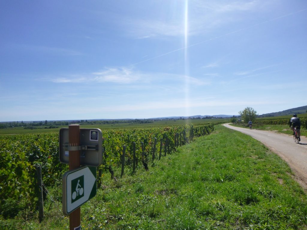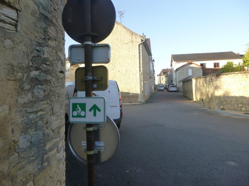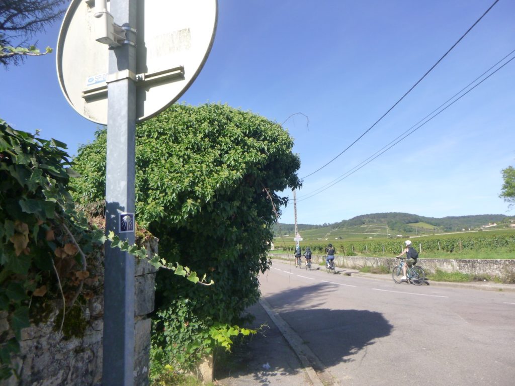 | Plus loin, une intersection se présente. La route principale file droit vers Puligny, mais le parcours, lui, reste fidèle à la piste cyclable, s’inclinant sagement vers la droite, suivant la marque des coquilles et la logique du pèlerinage. |